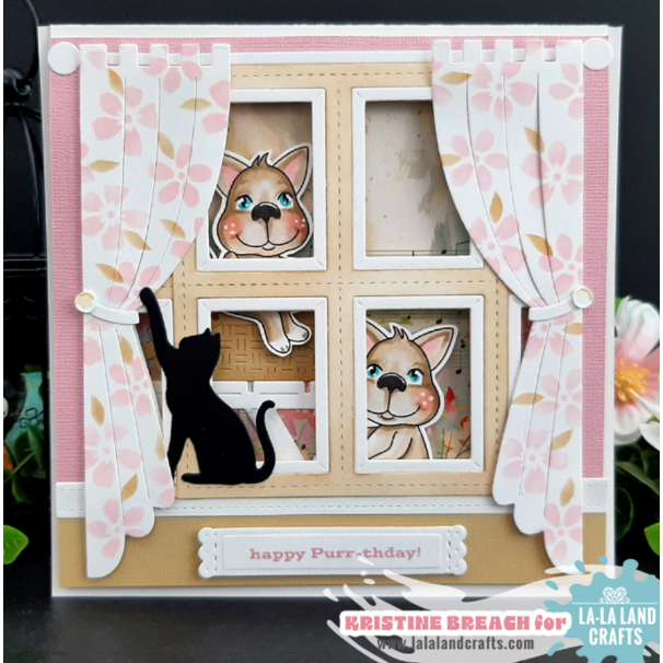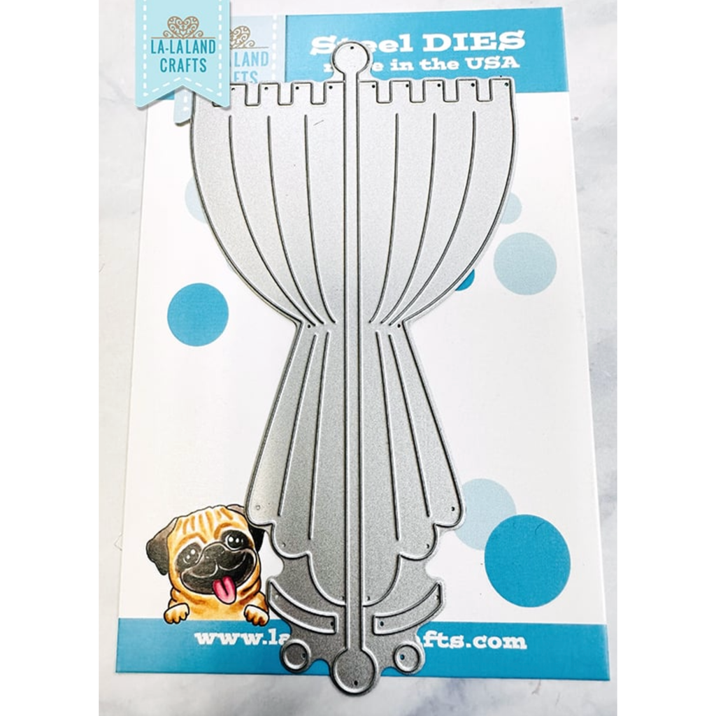 La-La Land Crafts Short Curtains Dies set includes two curtains pulled to the side and a rod, perfect for accents on window dies.