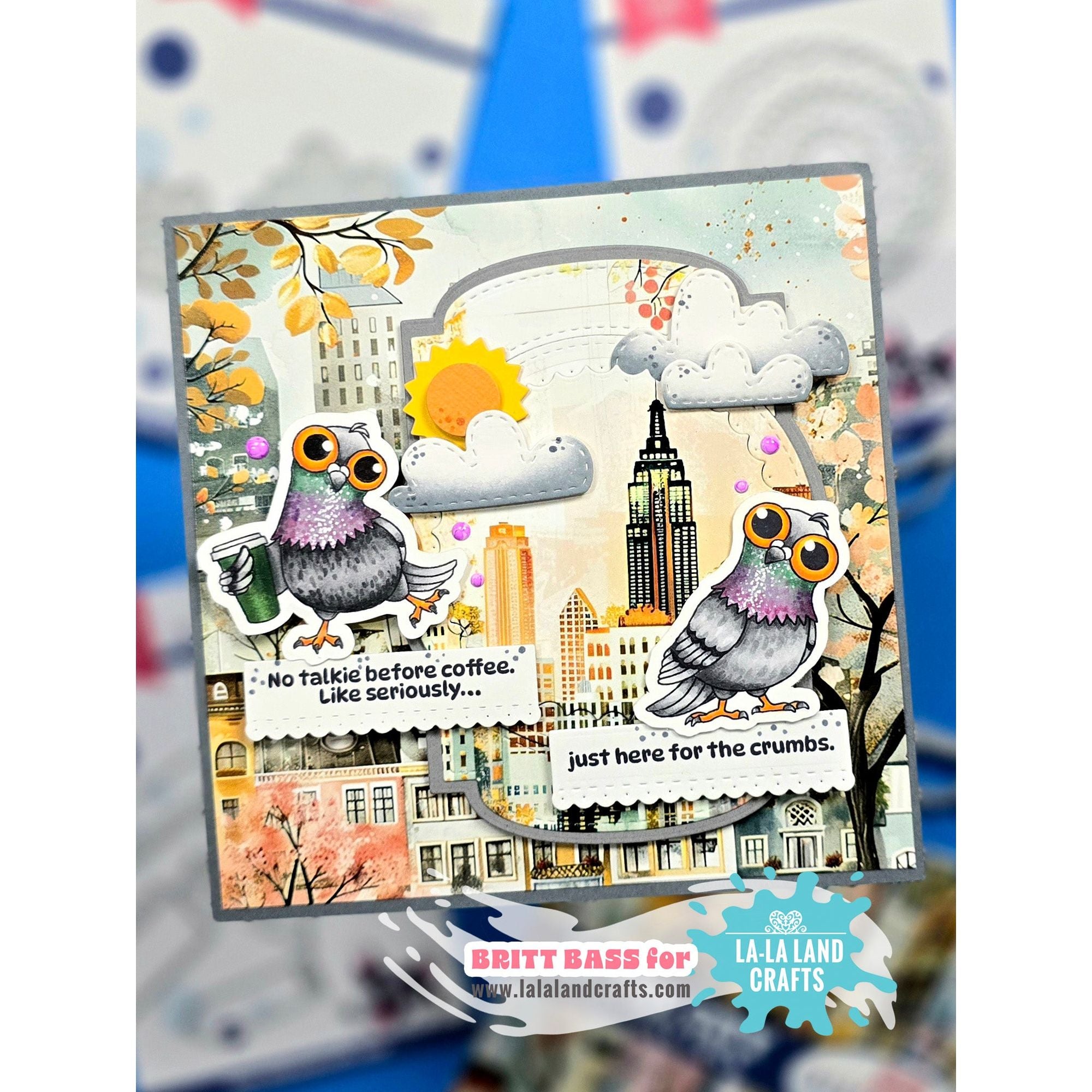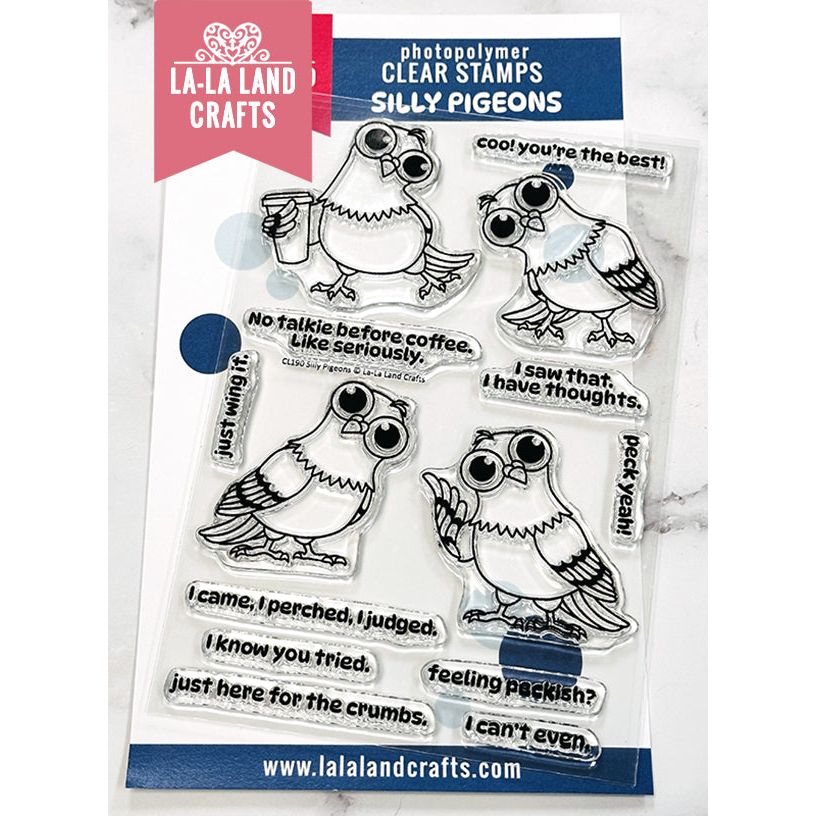 La-La Land Crafts Silly Pigeons Clear Stamps is a 4x6 inch clear stamp set featuring four quirky pigeons in various playful poses. The set also includes 10 snarky sentiments, making it perfect for adding humor and personality to your cards, tags, and paper crafts.