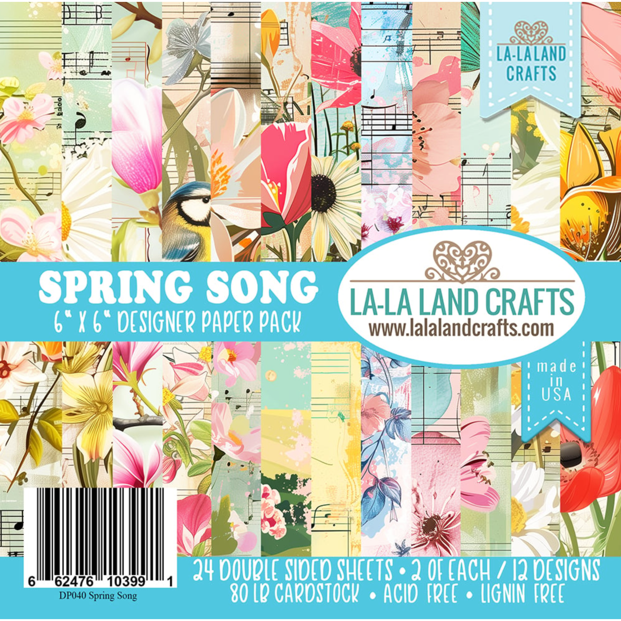 La-La Land Crafts Spring Song 6x6 inch Paper Pack features elegant backgrounds of flowers and music mixed together in soft colors with fun patterns.