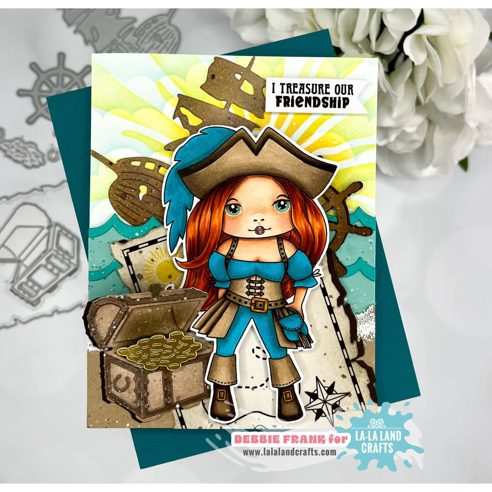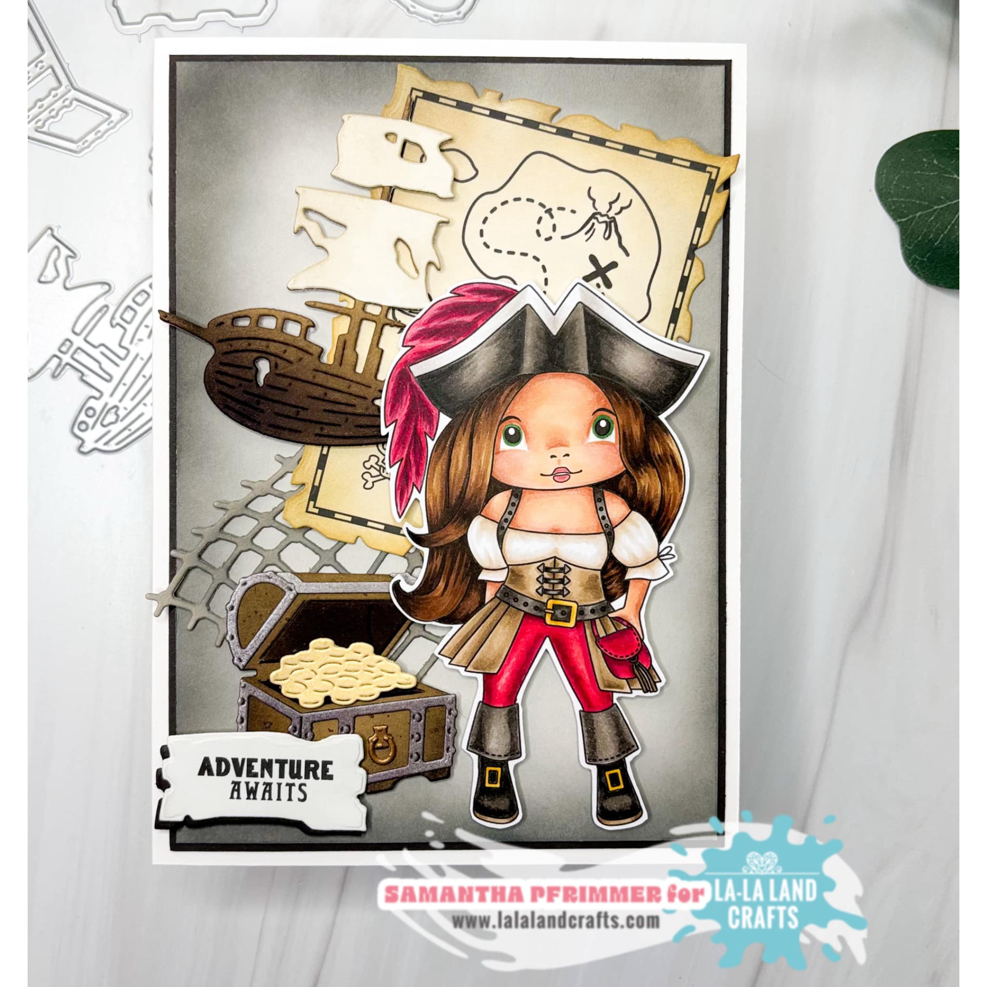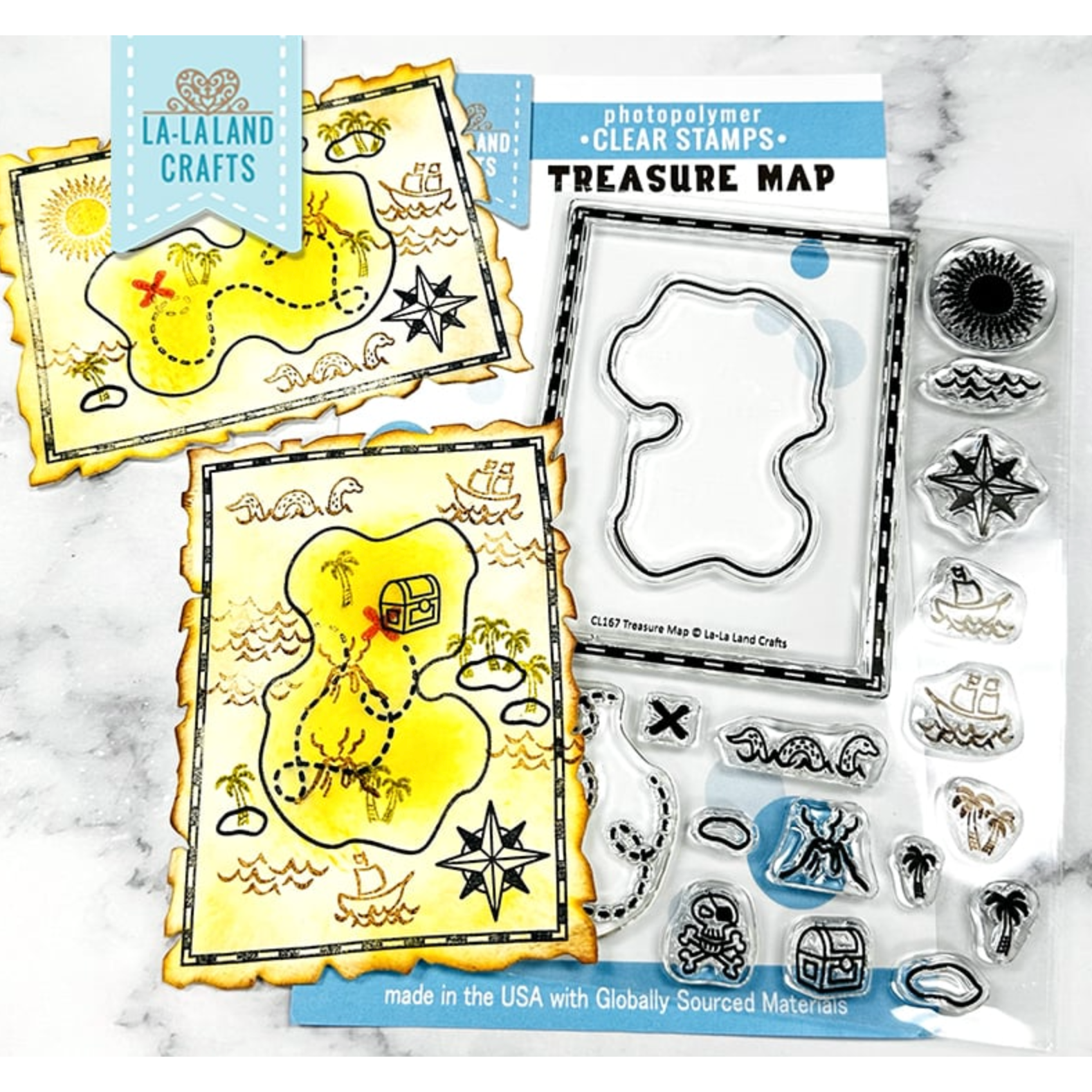 This 4x6 inch clear stamp set from La-La Land Crafts is full of adventure! Create your own treasure map with this exciting set. It includes a dotted frame to outline the blank landmass, a compass, a sun, two sailboats, palm trees, a sea monster, a treasure chest, a volcano, a pirate skull with crossbones, a dotted line, and an X to mark the spot. Perfect for adding a touch of adventure to your crafting projects!