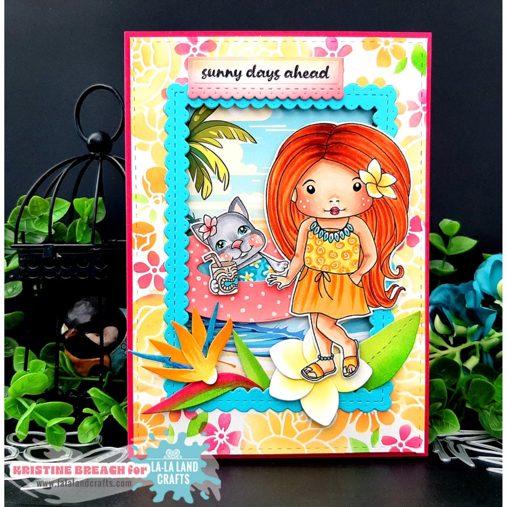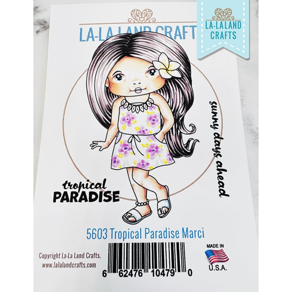 Marci is ready for a fun tropical adventure! She’s wearing her hair down with a flower tucked behind her ear, a cute dress, a chunky necklace, and slides. The set also includes two fun sentiments. Made in the USA from deep-etched red rubber and mounted on a cling cushion, this stamp is ready to be used with an acrylic block or stamping platform.