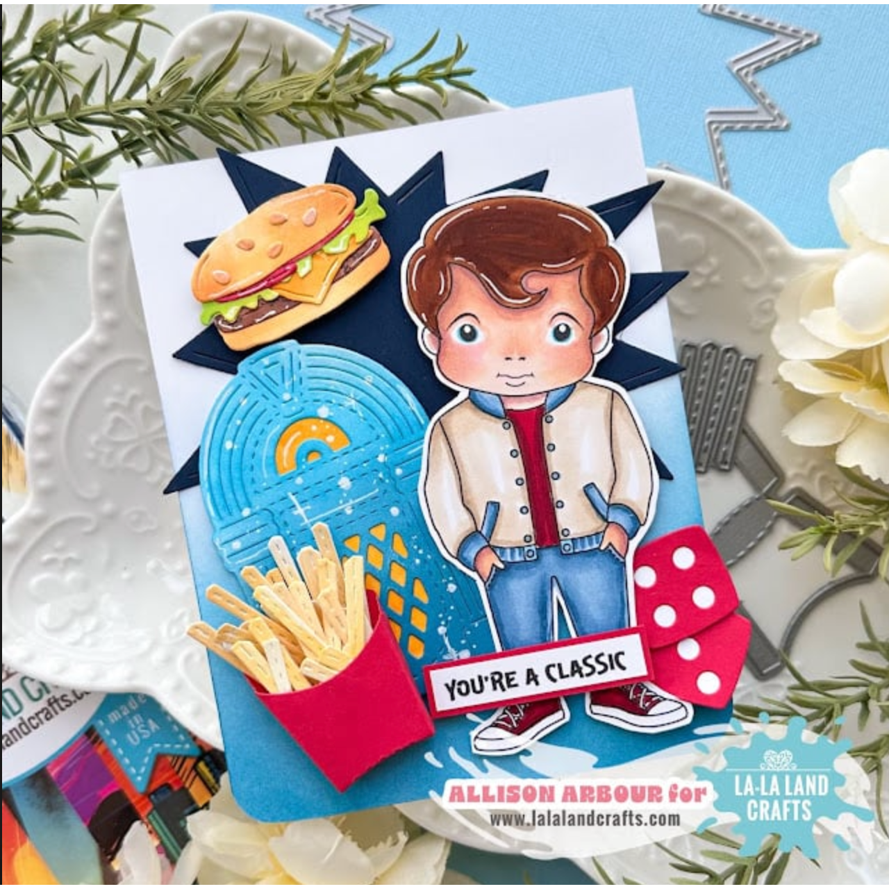 Measuring approximately 4.5 inches by 3.5 inches, this stamp set features a dapper young man sporting rolled-up jeans, sneakers, and a varsity jacket, along with two sentiments to add character to your creations!