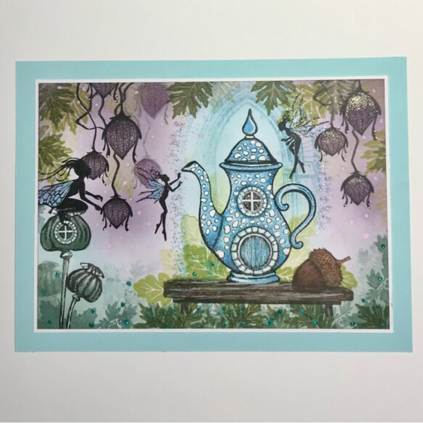The elegant teapot is illustrated with a circular wooden door and window, both framed by detailed stonework. The coordinating lid features a teardrop-shaped handle and stone accents to match the teapot's charming design.