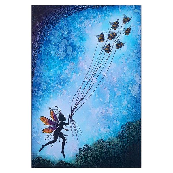 The Lavinia Stamps Lumus Small Clear Stamp is a silhouette stamp featuring a flying fairy named Lumus. This is the smaller version, with a larger version LAV897 sold separately. Lumus is depicted with textured clothing and detailed wings, extending her hand out. Stamp Size: 2.56 x 2.56 inches