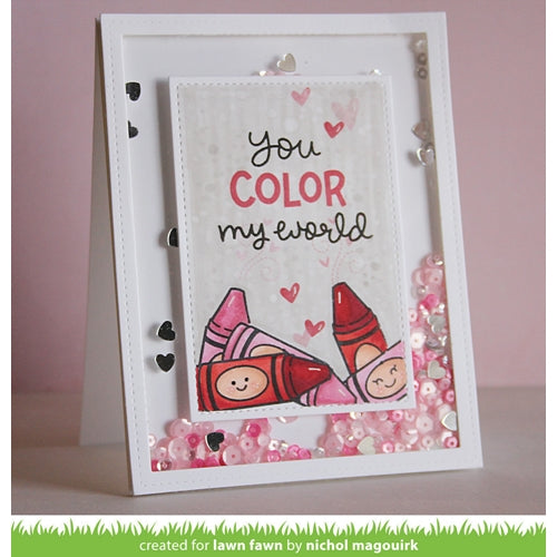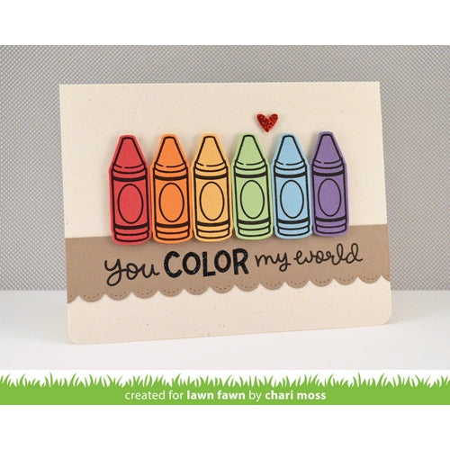 Add some color to your world with this mini set of four clear stamps! This set contains a crayon, sentiment, smiley face, and exclamation mark. This stamp set coordinates perfectly with Color my World Lawn Cuts custom craft dies.