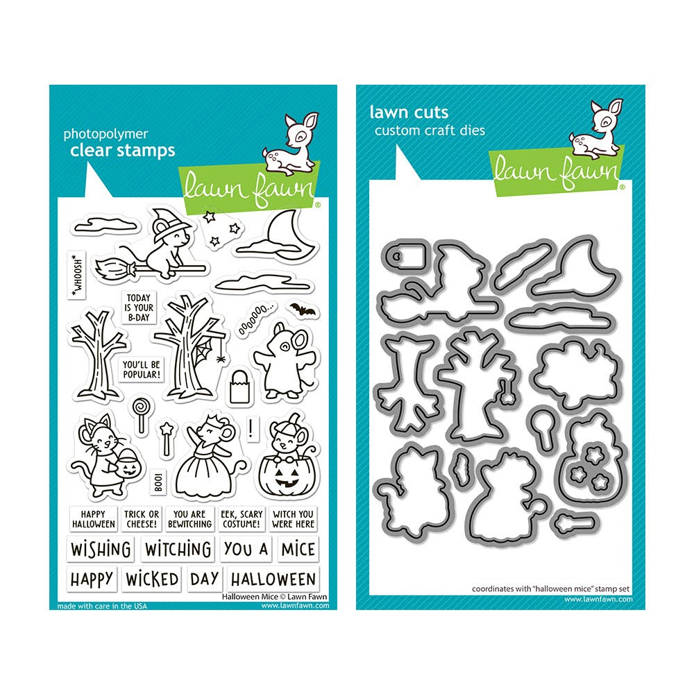 Get ready for a spellbinding Halloween with the Lawn Fawn Halloween Mice Stamps and Dies Set! This 4x6 inch set features adorable mice dressed as a flying witch, a cat trick-or-treater, a princess, a ghost, and a pumpkin popper, along with spooky trees and fun accessories. Pair these charming characters with All the Speech Bubbles stamps to create wickedly cute cards and crafts that capture the playful spirit of the season. Perfect for adding a magical touch to your Halloween projects! As a special bonus, this bundle includes the coordinating dies for perfect die cut results every time! Words and sentiments included: