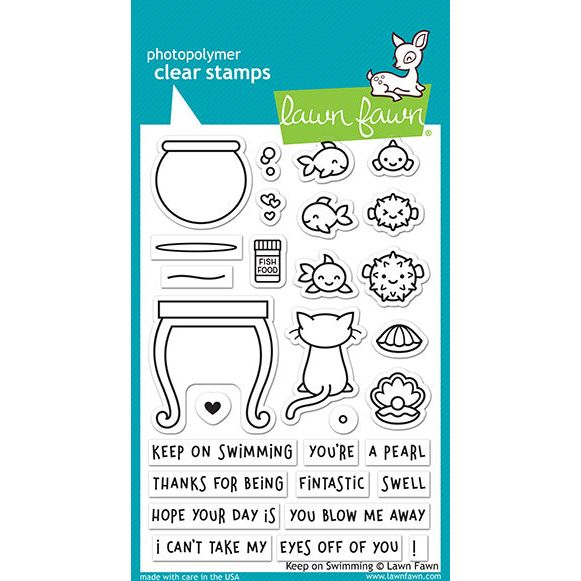 Make a splash with the Lawn Fawn Keep on Swimming Clear Stamps! Perfect for creating thank you, birthday, and encouragement cards, this set is fishbowl-themed and filled with adorable aquatic animals. Use it with coordinating sets like the Reveal Wheel from Lawn Fawn to make interactive and charming creations. 4x6 inch clear stamp set. Words and sentiments included:
