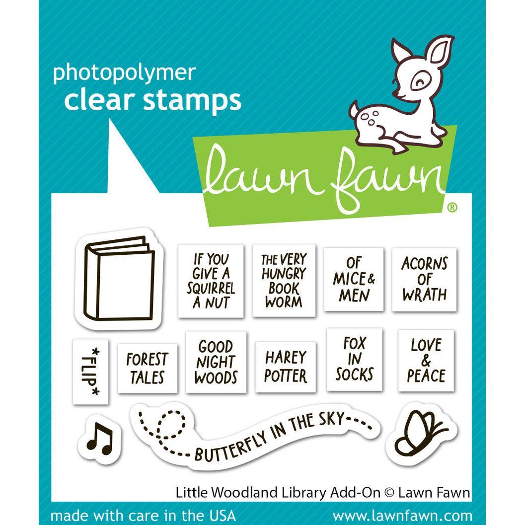 Add a playful touch to your book-themed projects with the Lawn Fawn Little Woodland Library Add-On Clear Stamps! Customize story titles in a punny way and add a charming touch of nostalgia with the butterfly and sentiment stamps. They even fit perfectly on the spine of the Book Collection! Don't miss out on pairing it with Little Woodland Library and Stitched Bookmark for a whimsical bookcase. 2x3 inch clear stamp set. Words and titles included: