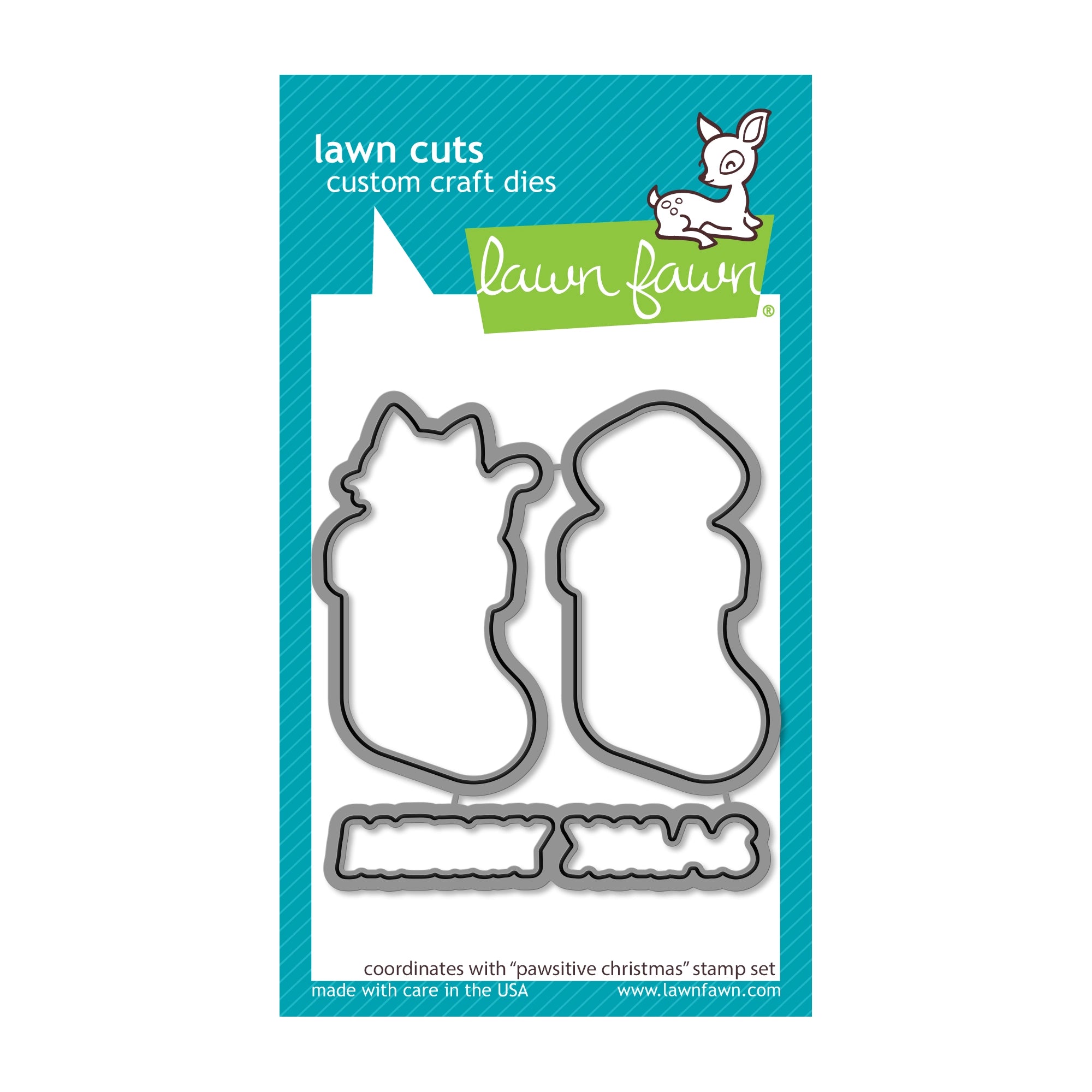 Make a special Christmas card for any pet lover with the Lawn Fawn Pawsitive Christmas Dies. This die set features coordinating die cuts with the Cat in Stocking, Dog in Stocking and Merry Xmas sentiment from the Lawn Fawn Pawsitive Christmas clear stamp set for easy and quick crafting. Get creative and make your own unique card this Christmas! Please refer to stamp set for approximate dimensions.