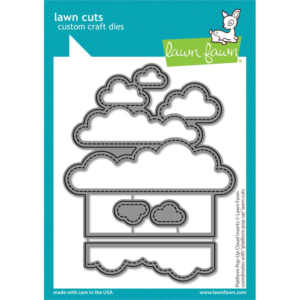 Lawn Fawn Platform Pop-Up Cloud Inserts Dies are a set of metal cutting dies that are designed to work with the Lawn Fawn Platform Pop-Up Die (sold separately) to create a pop-up card with a whimsical cloud design. The set includes three cloud inserts of varying sizes, which can be used to create layered clouds that pop up when the card is opened. Cloud insert measures approximately 3.625 x 3.75 inches.