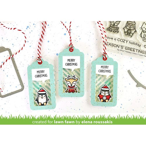 These festively dressed critters are here to help you wish all your loved ones a very happy holiday! This set of critters, speech bubbles, and sentiments coordinate perfectly with Say What Gift Tags from Lawn Fawn. Stamp set is approximately 3x4 inches. Approximate individual image measurements are in inches: deer 0.75 x 1, penguin 0.875 x 1, and cat 0.75 x 1.