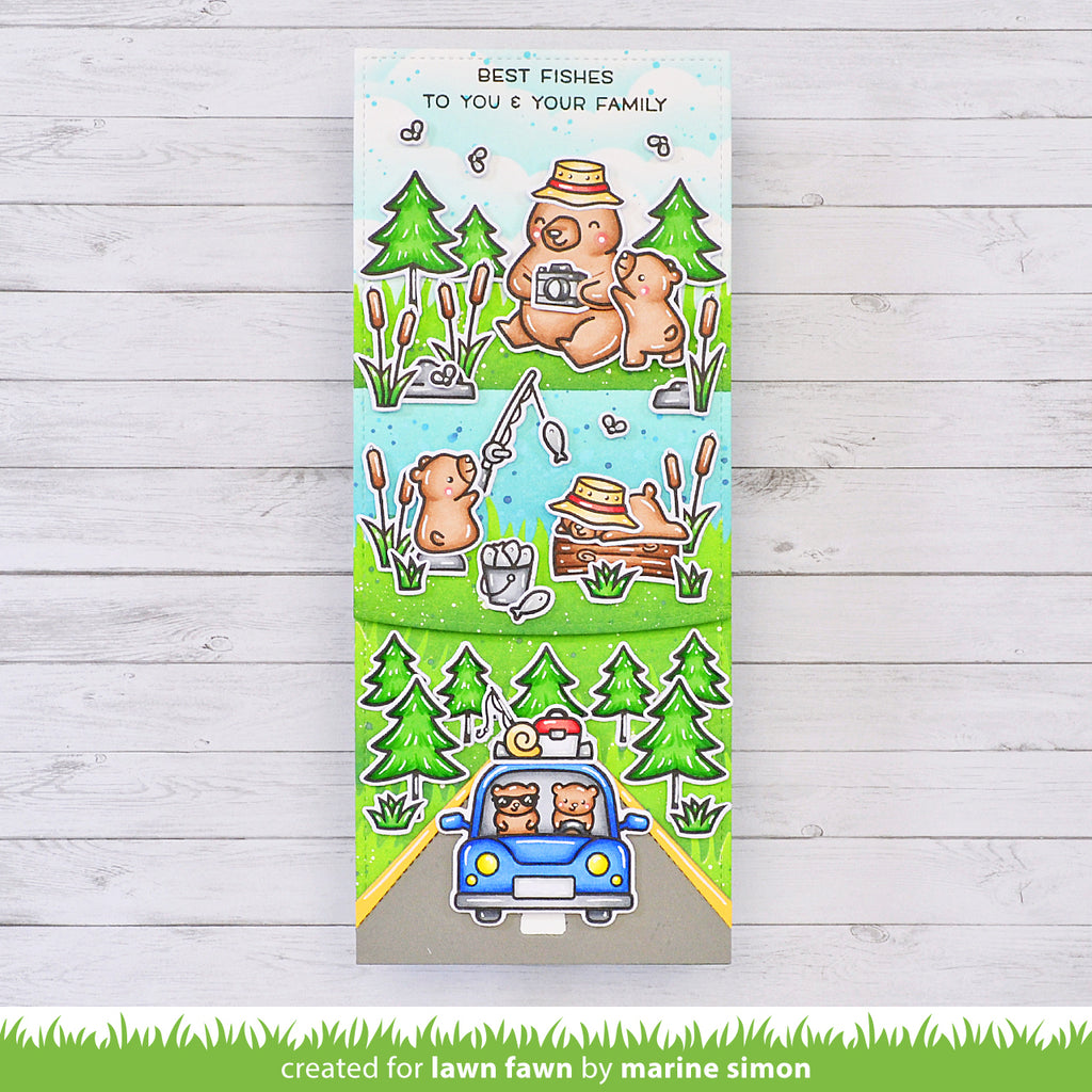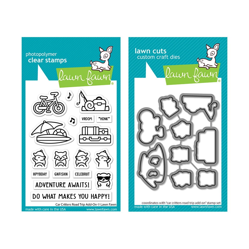Take along your cuddly friends on your next road trip with the Lawn Fawn Car Critters Road Trip Add-On Clear Stamps! With these stamps, you'll be ready for a beachy day, fishing fun, biking adventure, or wherever your summer getaway takes you! Hop in the car and let's go! The overall stamp set is 3x4 inches and includes a bicycle, luggage, fishing supplies, a surfboard, buoy, and umbrella, a bear with sunglasses, a driving fox and the following sentiments or words: "vroom", "*honk*", "hpybday", "gnfshn", "celebr8t" (these are perfect to don on your license plate!) as well as "adventure awaits!" and "do what makes you happy!" This stamp and die set also includes the coordinating die set to cut our your images perfectly!