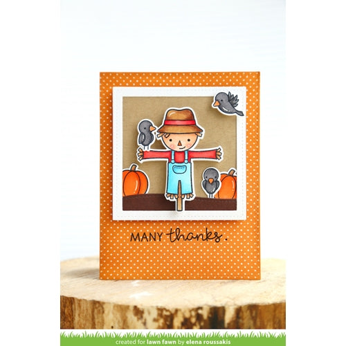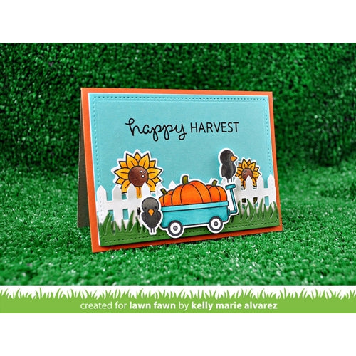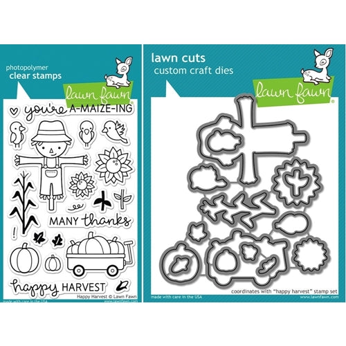 Lawn Fawn's Happy Harvest stamp set features 21 pieces of high-quality clear stamps, perfect for creating the perfect fall scene. This 4x6 inch set includes a scarecrow, two sunflowers, three blackbirds, various leaves and cornstalks, pumpkins, and a wagon. Create beautiful, timeless craft pieces with this clear stamp set. This set also includes the coordinating dies to cut out select pieces from the stamp set!