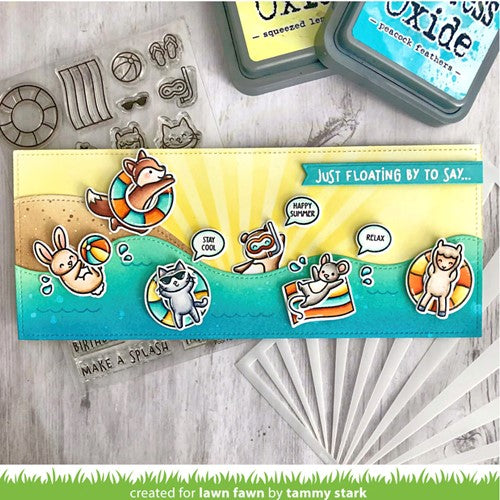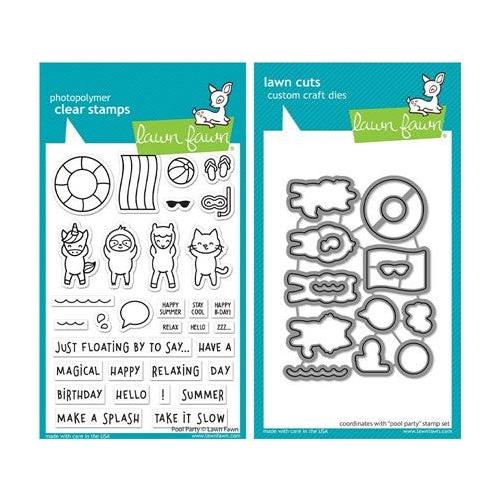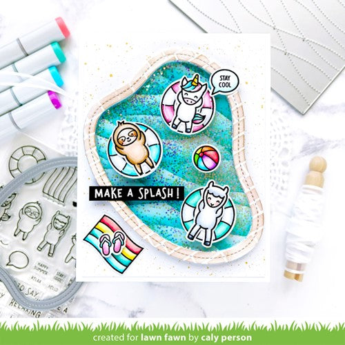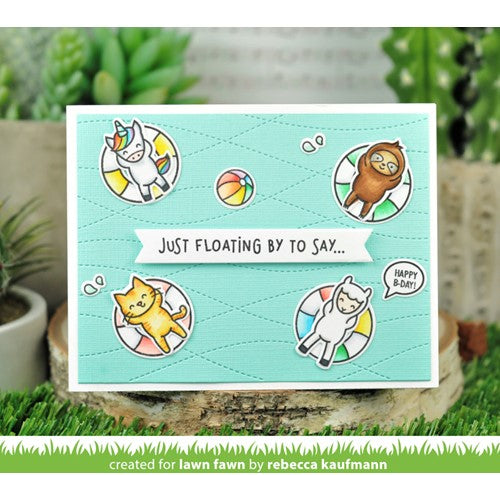 We have taken some favorite critters to the pool! The unicorn, sloth, llama and cat are ready to enjoy lounging on pool floats and sending sunny summer greetings! Overall set is 4x6 inches. Approximate individual items are in inches: floatie: 1.125 x 1.125, beach ball: 0.5 x 0.5, sloth: 0.625 x 1.25, and llama: 0.5 x 1.375. Also includes coordinating die set!