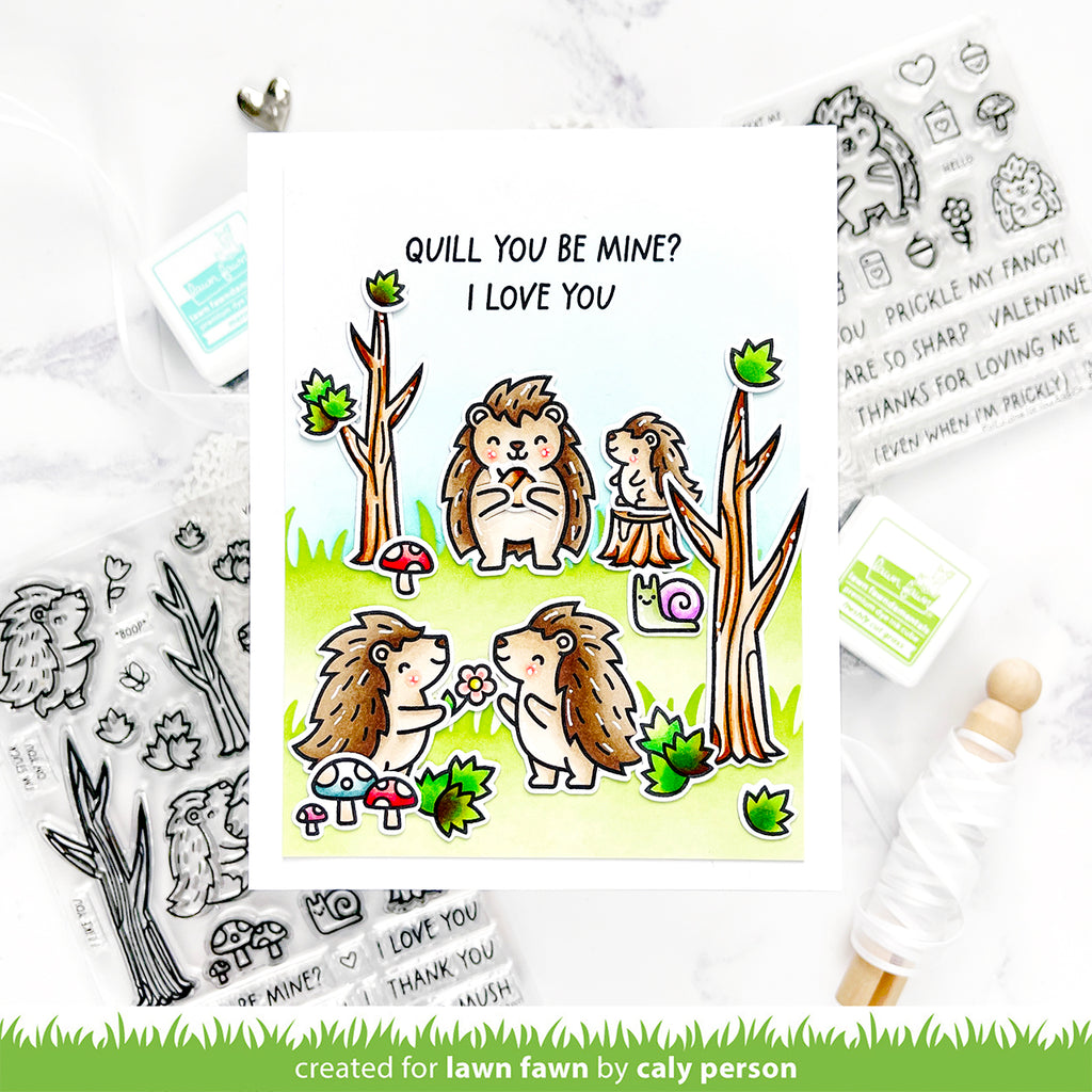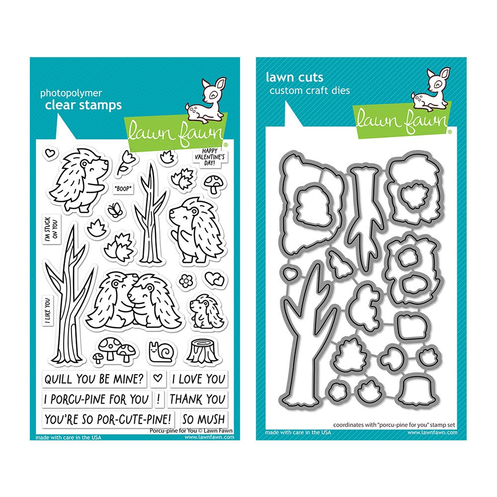 This 31-piece 4x6 inch clear stamp set features delightful porcupine pals (including two mirrored stand alone porcupines, one small porcupine, and one hugging set of porcupines) to help you celebrate Valentine's Day, anniversaries and more. Create a special scene with the included trees, leaves, snail, mushrooms, tree stump, heart, butterfly, and flowers. Add more friends and sentiments with the Porcu-Pine for You Add-On for joyful, interactive cards. This set also includes the coordinating dies to cut out icons from the stamp set perfectly every time! Words and sentiments included: