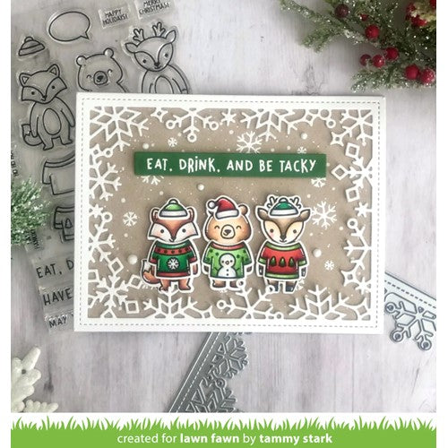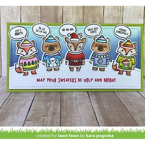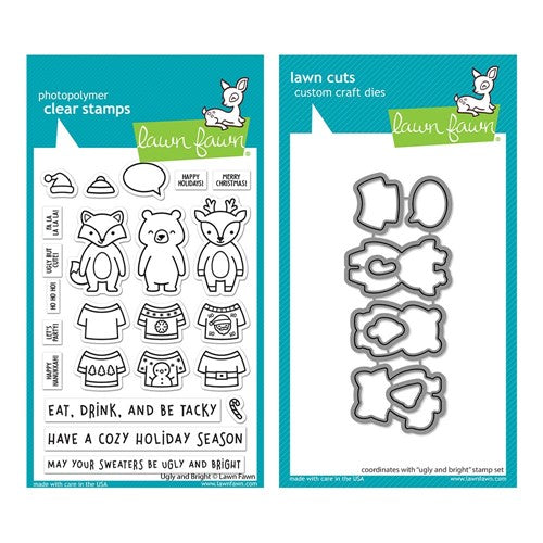 The critters are dressing in their ugliest sweaters to celebrate the holiday season! Mix and match the six included ugly sweaters to send cozy greetings to all your friends and family! The speech bubble and included sentiments will help you celebrate all season long. Overall stamp set is 4x6 inches. Individual components measurements are approximate and in inches: fox 1 x 1.5, bear 0.875 x 1.5, and deer 1 x 1.625. This set also includes the coordinating dies!