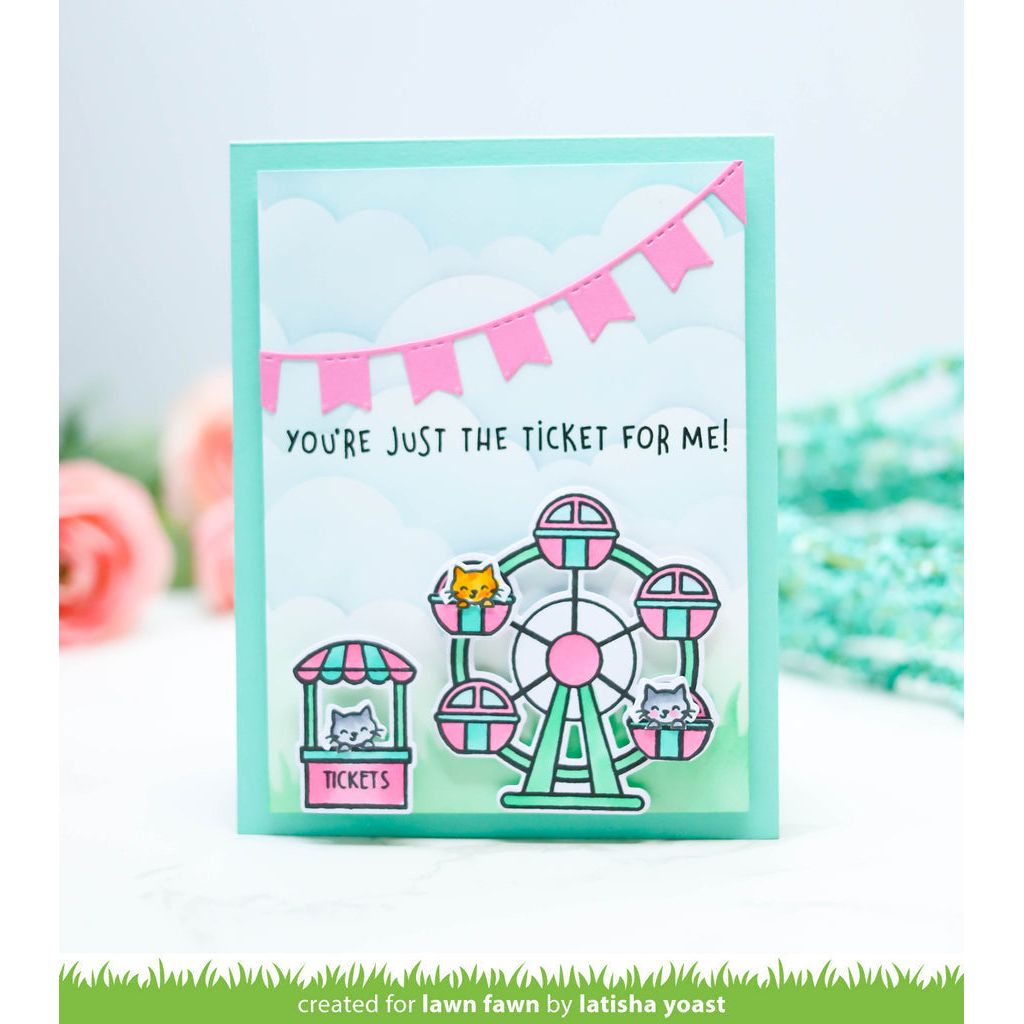 Lawn Fawn is a company that produces clear stamps for use in paper crafting and scrapbooking. The "Wheely Great Day" clear stamp set features a variety of cute images related to a day of Summer fun at the fair including a ferris wheel, a ticket booth, a ticket, an additional seat for the ferris wheel, critters to fit perfectly in the scene including a bunny rabbit, bear, fox, reindeer or deer, frog, and cat, as well as a star, heart, and two unique smile faces. Words or sentiments included are: