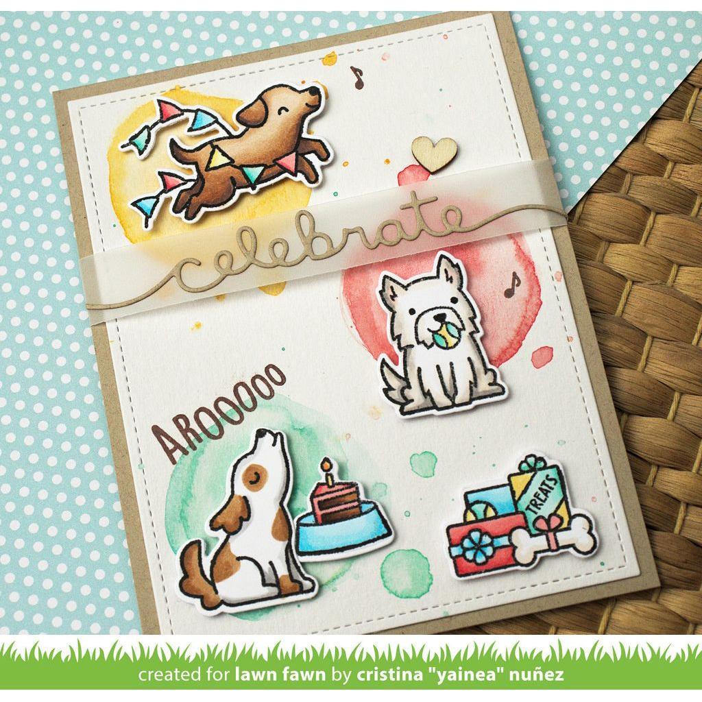 Celebrate your pup's birthday in the most pawsome way with Lawn Fawn's Yappy Birthday Add-On Clear Stamps! With lots of doggos, a pup-cake and plenty of treats, these stamps give any pup-arazzi the perfect pawsitive photo opp! Bark out a wish and get ready for good times (and good toppers)! This set pairs perfectly with Lawn Fawn's Yappy Birthday stamps and dies or is fabulous on its own for a great project! It contains a dog running through a pennant, a dog balloon animal, a cupcake with a bone, a paw print, blades of grass, a dog with a tennis ball in its mouth, a party hat, and more! Overall stamp set is 3x4 inches and includes the sentiments: