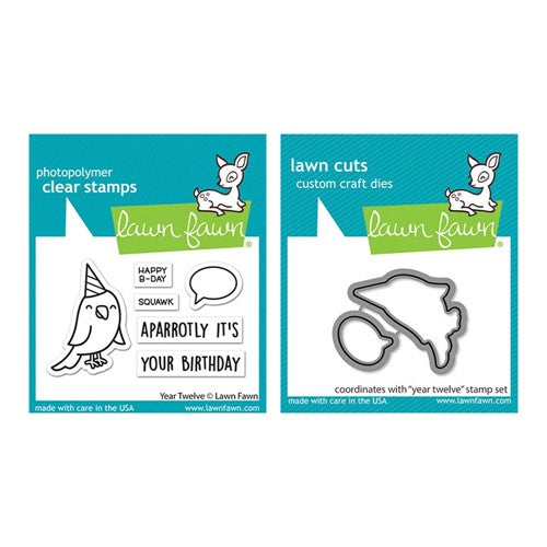 Aparrotly it's our 12th birthday! This cute stamp set was created to celebrate Lawn Fawn’s twelfth birthday! Woohoo! Approximate sizes are in inches: party parrot: 1.5 x 1 and speech bubble: 0.625 x 0.5. Overall stamp set is 2x3 inches. This set also includes the coordinating die set.