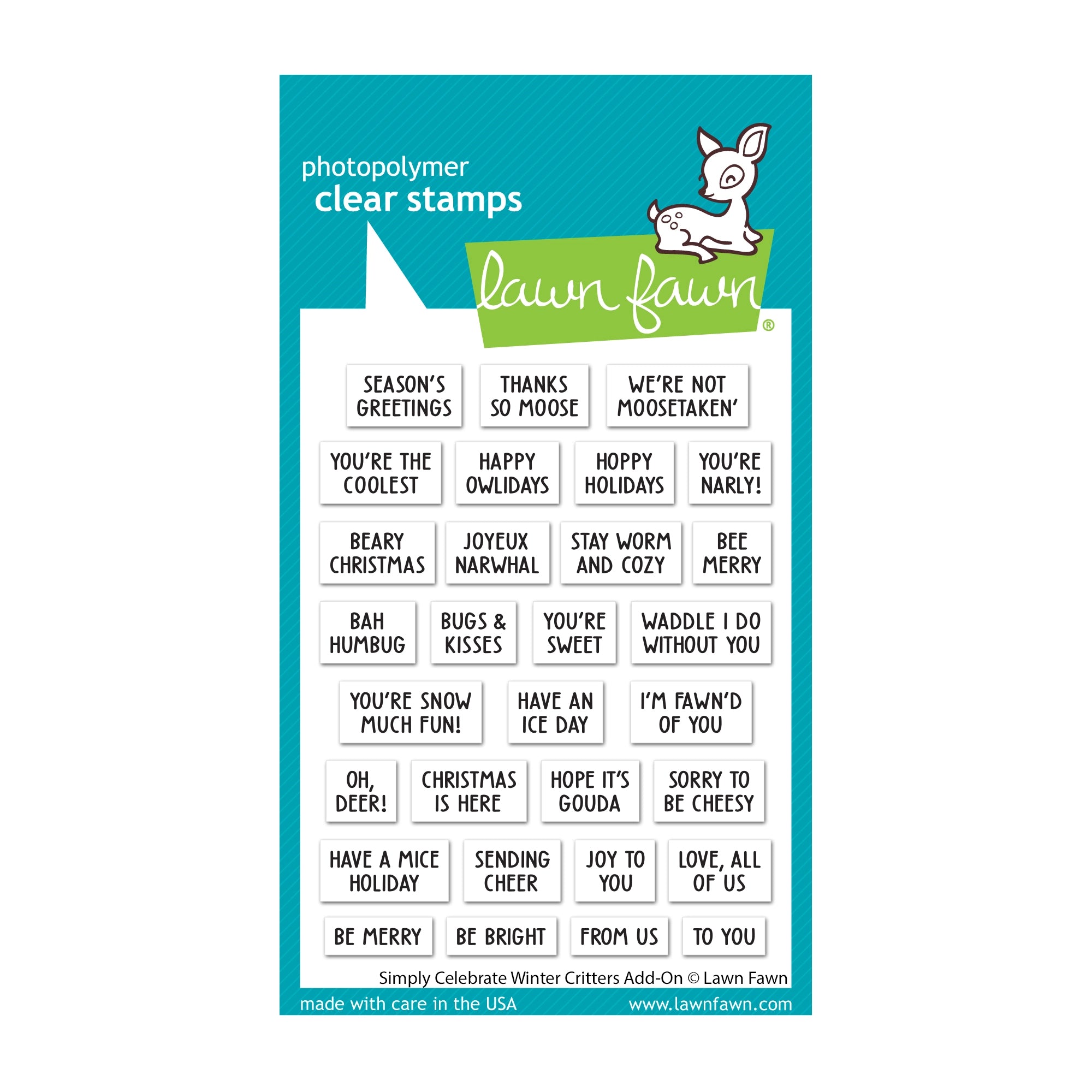 This 3x4 inch stamp set from Lawn Fawn allows you to create the perfect punny holiday sentiments to complement the Lawn Fawn Simply Celebrate Winter Critters set. With its clear images and precise designs, you can create beautiful cards for all your seasonal celebrations.