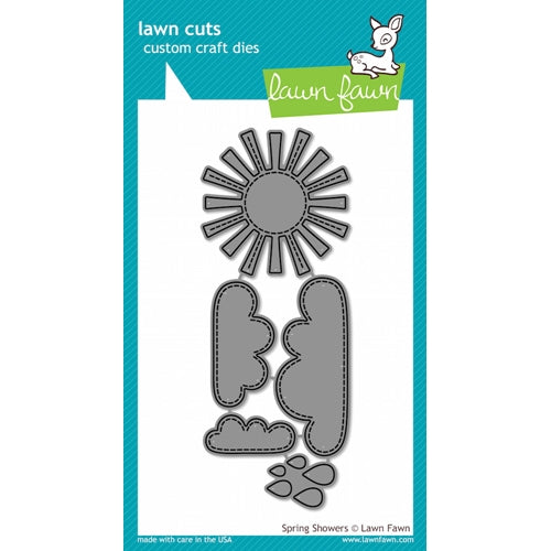 Lawn Cuts custom craft dies are high-quality steel, made in the USA, and are compatible with most die cutting machines! Spring Showers includes a sun and three clouds with cute "stitched" border details, as well as five raindrops in different sizes.