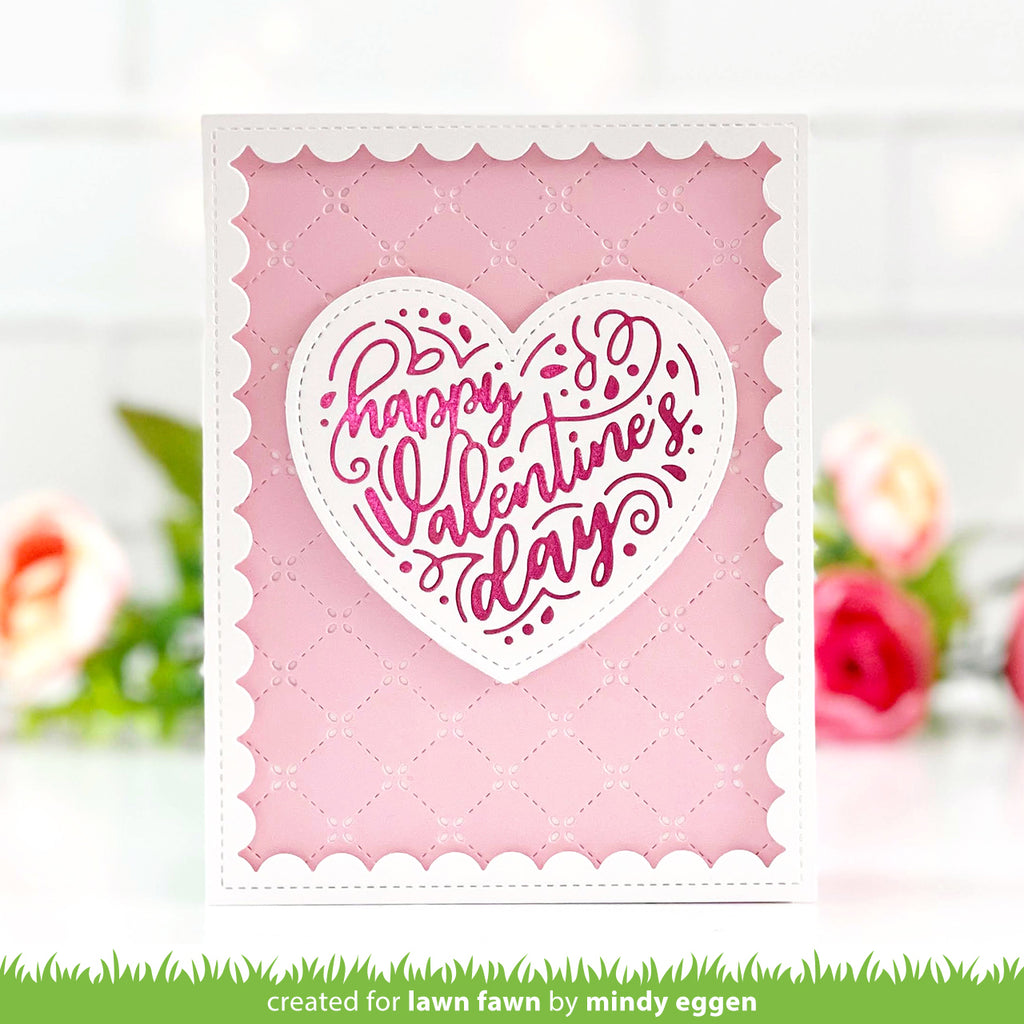 Create a special Valentine’s Day card with the Lawn Fawn Stitched Happy Heart Dies. This 7-piece die set features a cute “stitched” border detail on the outside and inside of the heart, plus adorable pieces to create a hugging heart. It also coordinates perfectly with the Foiled Sentiments: Happy Valentine's Day die set from Lawn Fawn! Entire set measures approximately 6.375 x 4.5 inches; Assembled Happy Heart measures approximately 3.125 x 2.875 inches.
