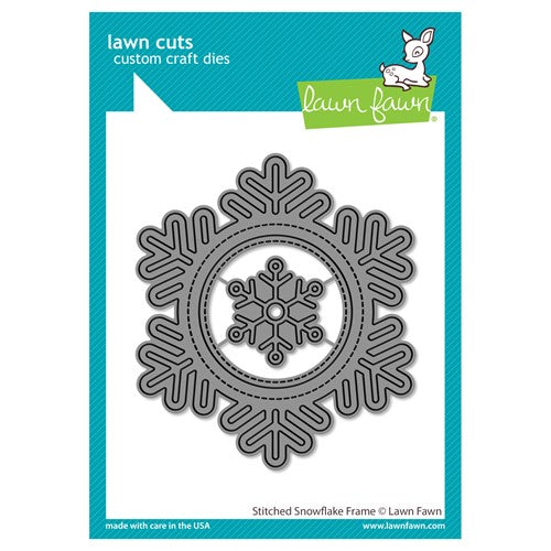 This stitched snowflake frame coordinates with Outside In Stitched Snowflake from Lawn Fawn, and it’s perfect for shakers and other fun projects! This die comes with a beautiful smaller snowflake that can also be used as a tag. Approximate sizes are in inches: stitched snowflake frame: 3.375 x 3.75 and small snowflake: 1.125 x 1.25.