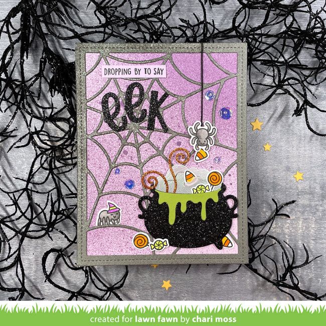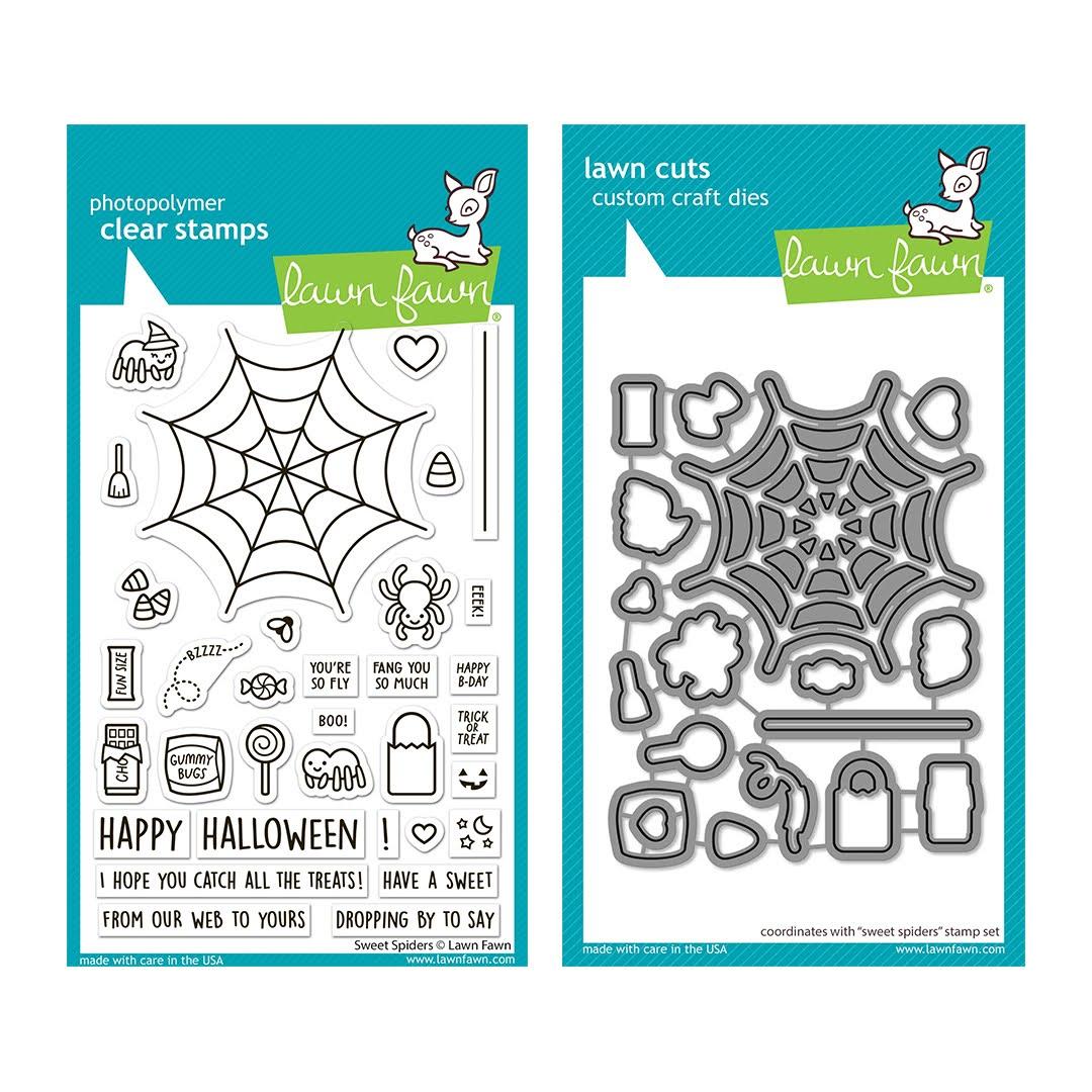 Get entangled in cuteness with Lawn Fawn's Sweet Spiders Stamps and Dies Set! This 4x6 inch set allows you to create a sticky but charming Halloween home for your spiders, filled with yummy treats. Heat embossing with white or black powder adds a shiny web effect. Use with Swivel Surprise or Give It a Whirl for interactive fun, or pair with the Spiderweb Backdrop for a quick and easy card. Spooktacular! As a special bonus, this bundle includes the coordinating die set for perfect results every time! Words and sentiments included: