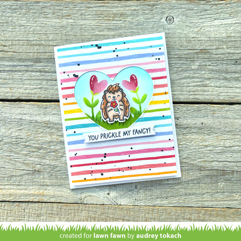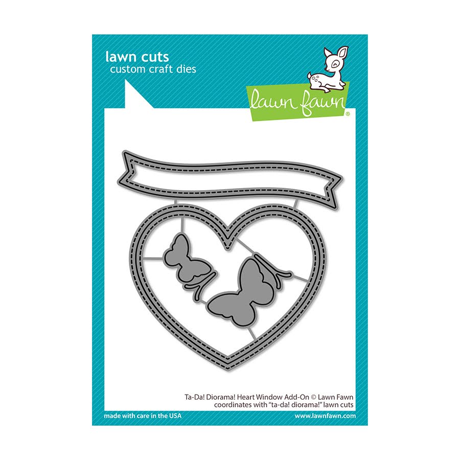 The Lawn Fawn Ta-Da! Diorama! Heart Window Add-On Dies create a beautiful heart-shaped window with realistic stitched detailing to add a special touch to your interactive projects. The set also includes a stitched wavy banner and 3D butterflies for a lifelike look.