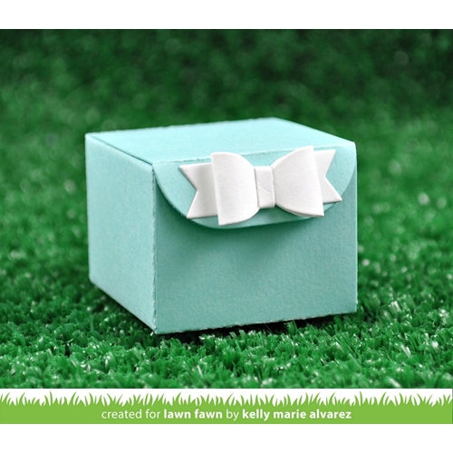 Approximate die sizes: assembled box: 1.5 x 1.5 x 1.125 inches, circle: 1.125 x 1.125 inches, hearts: 0.75 x 0.75 inches, star 0.675 x 0.675 inches, and assembled bow with tails: 1.125 x 0.875 inches. Overall approximate flat dimensions are 4.5 x 5.75 inches.