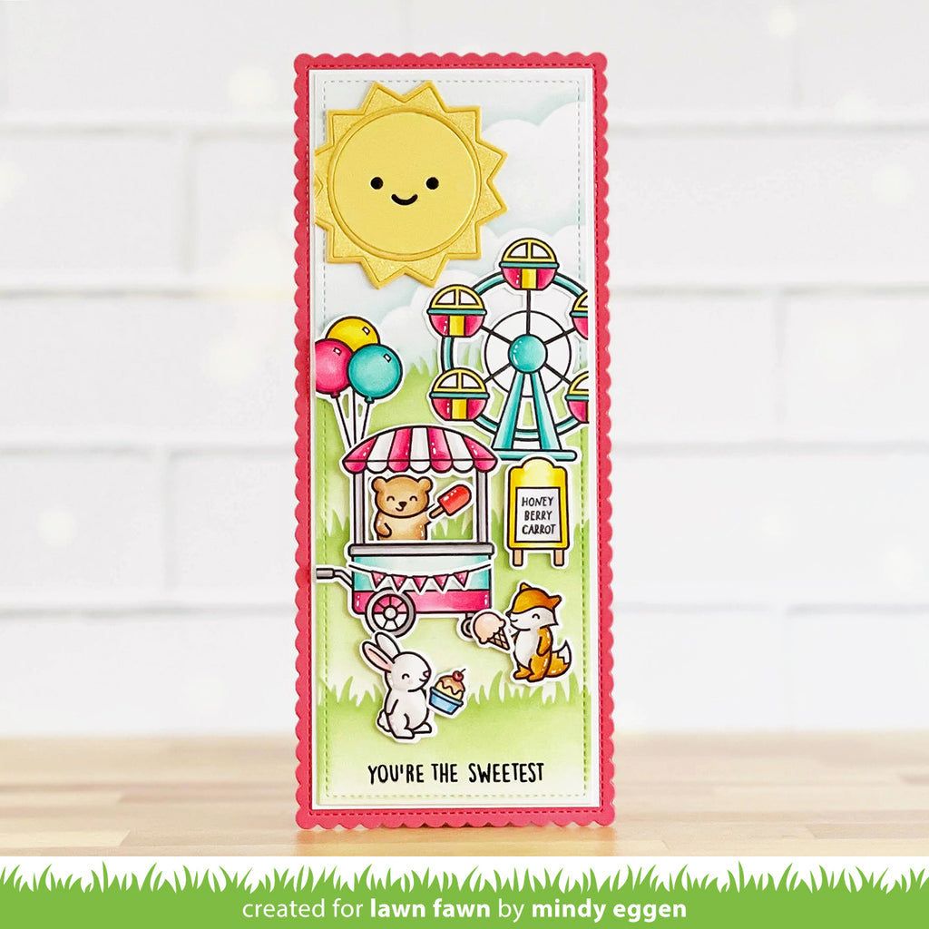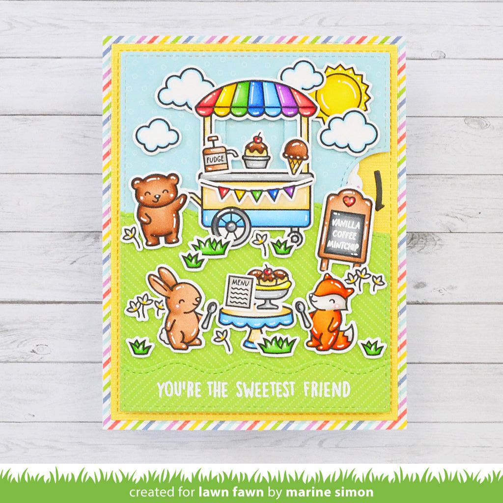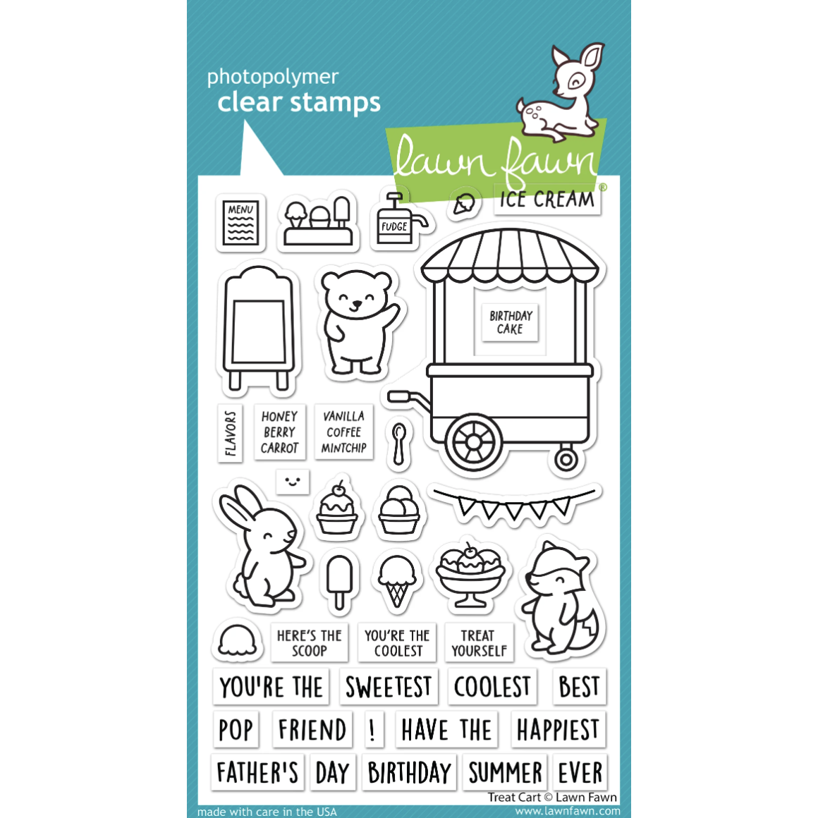 Sweeten up your summer cards and crafts with the Lawn Fawn Treat Cart Clear Stamps! This 39-piece 4x6 inch set includes everything you need to create a unique and cool way to show Dad he's the best this Father's Day. Don't miss out on the coordinating banner dies and added puns of the Treat Cart Sentiment Add-On set. Get ready to add a sprinkle of fun to any occasion! Words and sentiments included: