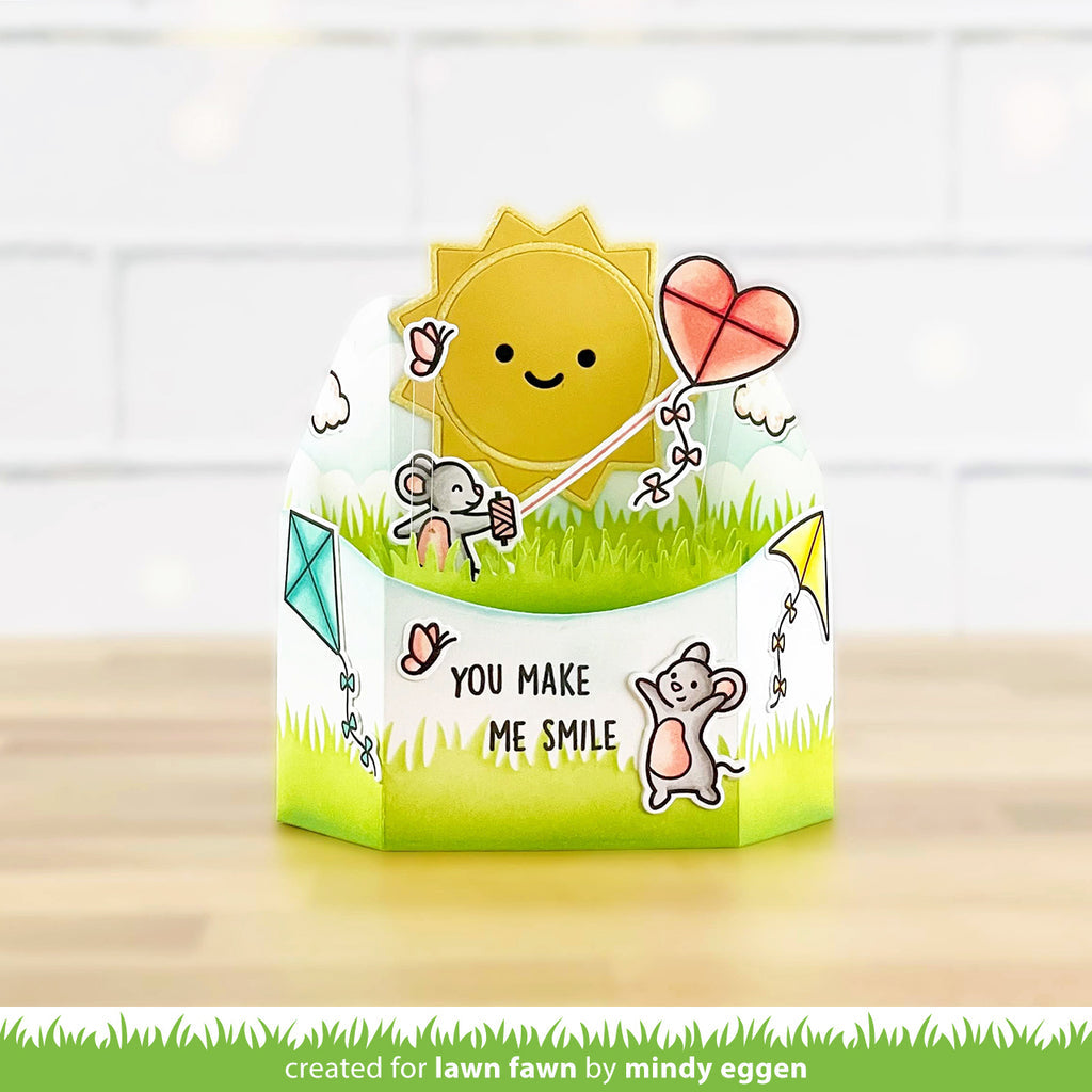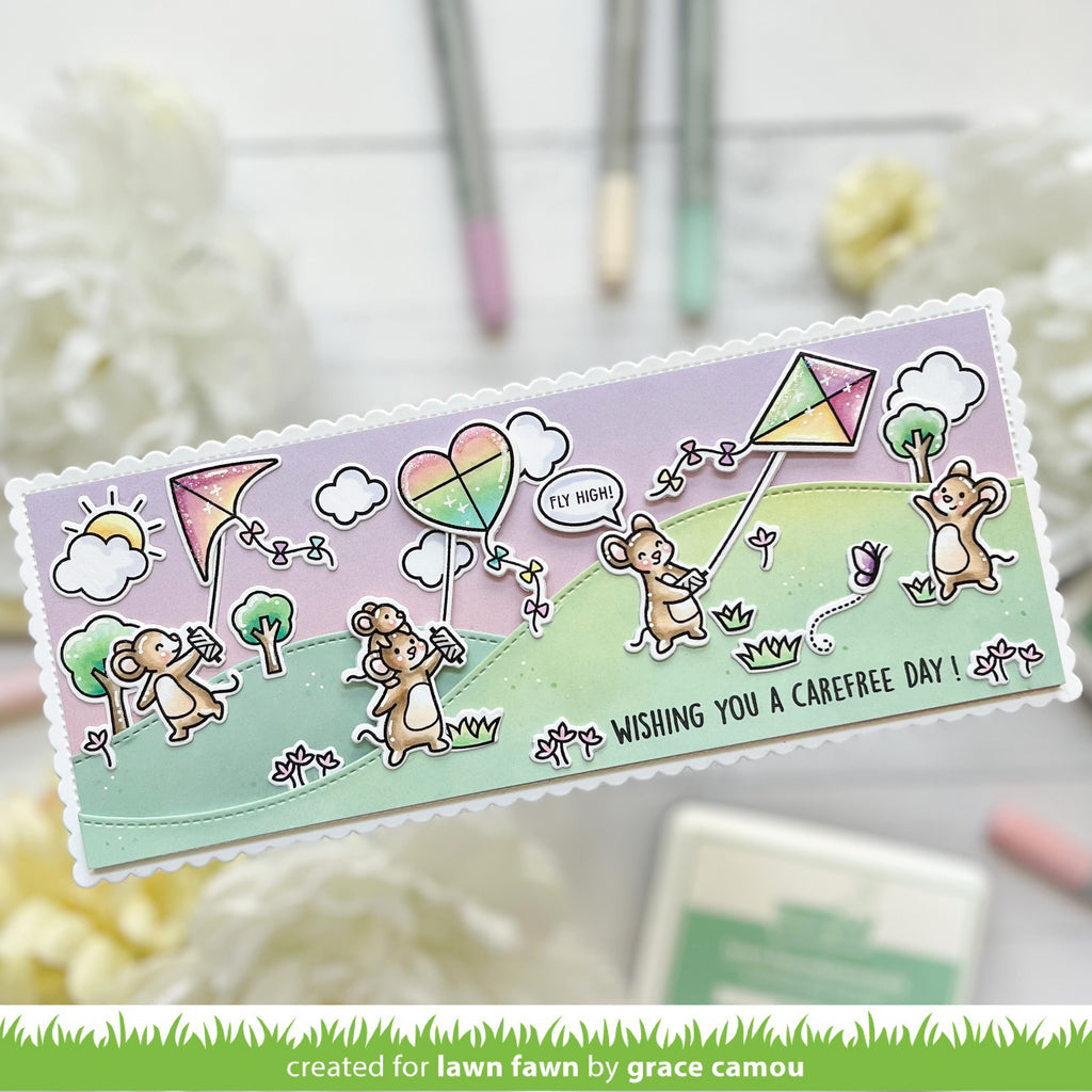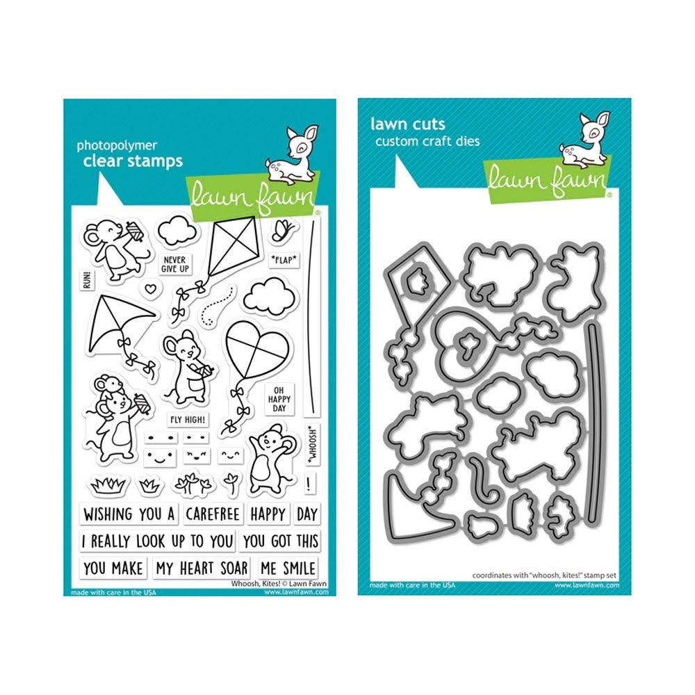 Fly high with Lawn Fawn Whoosh, Kites! Clear Stamps and Dies Set. These adorable kite-flying mice bring endless creativity with a 4x6 inch 39-piece set. Build scenes with clouds, grass, flowers, and a dainty butterfly. No need to wait for wind, the included string is ready for takeoff! This awesome set includes the coordinating dies for perfect cuts every time! Words and sentiments included: