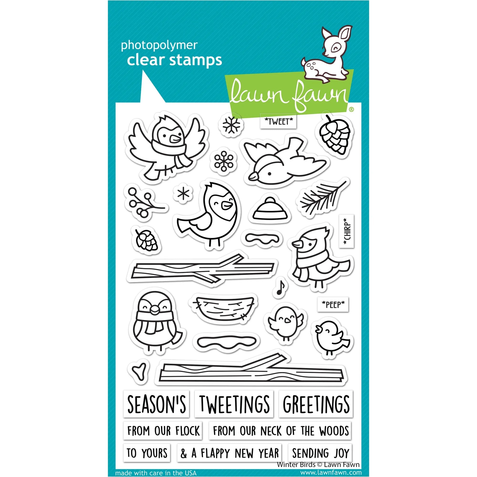 This Winter Birds Clear Stamp Set from Lawn Fawn is perfect for sending your holiday season greetings. It features a family of winter birds, branches with pinecones, pine needles, berries, and snow! Use with Lawn Fawn's Winter Birds Add-Ons (sold separately) for more sentiments and feathered friends. There's a pinecone 0.5 x 0.625 inches, bird smiling facing side 1 x 1 inch, bird with open wings flying 1.375 x 0.75 inches, and small branch 2.375 x 0.5 inch. Make the season special!