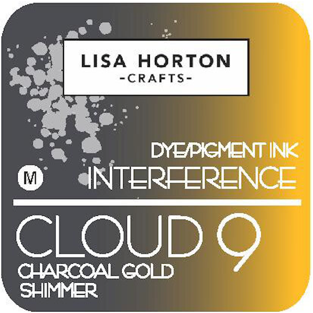 The Cloud 9 Charcoal Gold Shimmer Interference Ink Pad from Lisa Horton Crafts is a highly pigmented dye and pigment ink that adds a metallic shimmer to your projects. This unique ink changes color on different cardstock colors, showcasing its "interference color" effect. The right side of the label shows the ink on white cardstock, while the left side shows it on darker cardstock. Perfect for faux bleaching techniques, stencils, blending, and stamping, this versatile ink pad measures 3 x 3 inches, making it an essential addition to your crafting supplies.