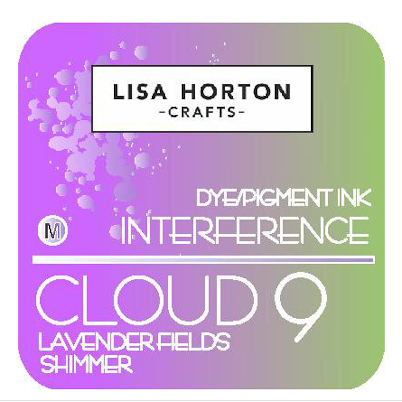 The Cloud 9 Lavender Fields Shimmer Interference Ink Pad from Lisa Horton Crafts is a highly pigmented dye and pigment ink that adds a metallic shimmer to your projects. This unique ink changes color on different cardstock colors, showcasing its "interference color" effect. The left side of the label shows the ink on white cardstock, while the right side shows it on darker cardstock. Perfect for faux bleaching techniques, stencils, blending, and stamping, this versatile ink pad measures 3 x 3 inches, making it an essential addition to your crafting supplies.