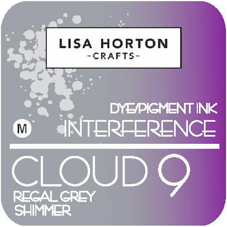 The Cloud 9 Regal Grey Shimmer Interference Ink Pad from Lisa Horton Crafts is a highly pigmented dye and pigment ink that adds a metallic shimmer to your projects. This unique ink changes color on different cardstock colors, showcasing its "interference color" effect. The right side of the label shows the ink on white cardstock, while the left side shows it on darker cardstock. Perfect for faux bleaching techniques, stencils, blending, and stamping, this versatile ink pad measures 3 x 3 inches, making it an essential addition to your crafting supplies.