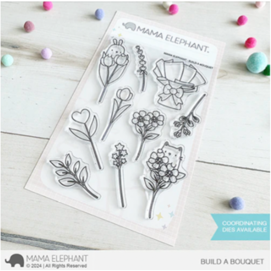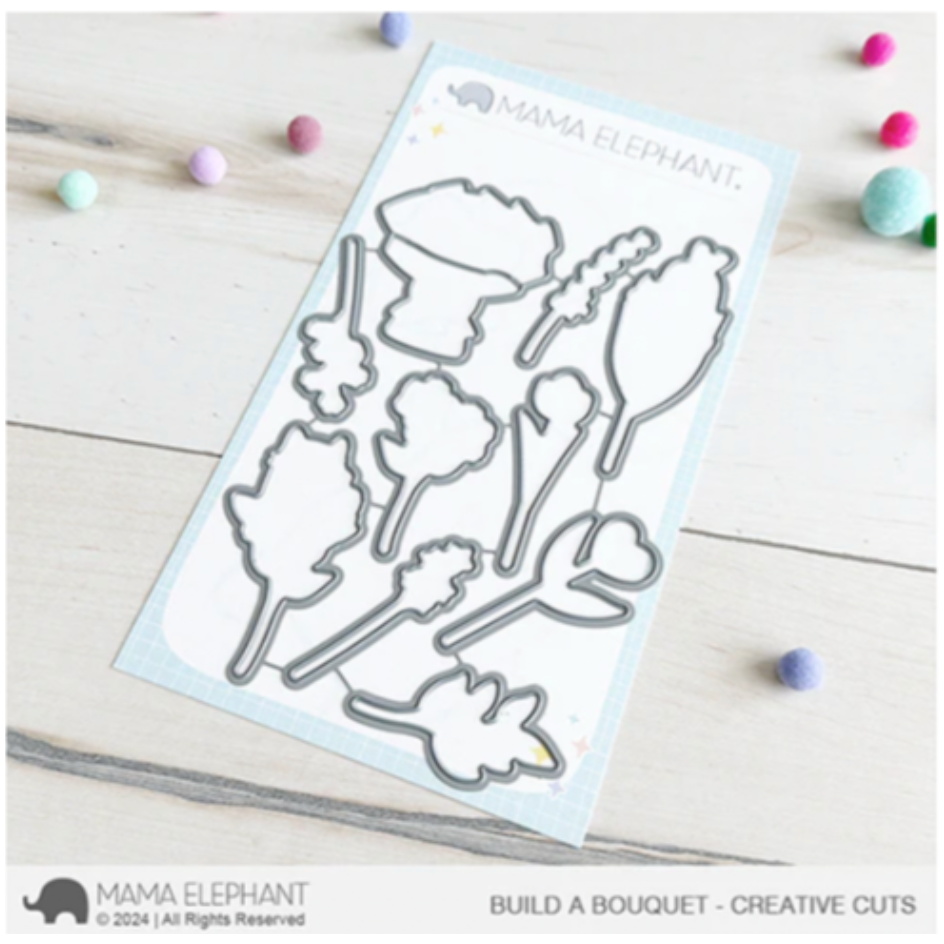 The Mama Elephant Build A Bouquet Clear Stamp and Die Set is a delightful collection for crafting enthusiasts. The 4x6 inch clear stamp set features 9 images of various flowers, some with charming critters peeking out, and includes a paper wrapper to assemble your bouquet. The coordinating Creative Cuts Steel Dies set comprises 10 dies, designed to precisely cut out each stamped image, facilitating easy layering and dimension in your projects. This set is perfect for creating personalized floral arrangements with adorable details.