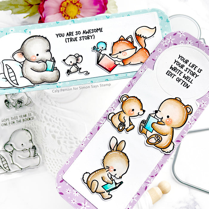 The Mama Elephant Book Club clear stamp set is a delightful addition to your stamp collection, perfect for celebrating the joy of reading. This set includes 7 image stamps featuring adorable critters immersed in their favorite books, as well as 3 sentiment stamps to complement your projects.