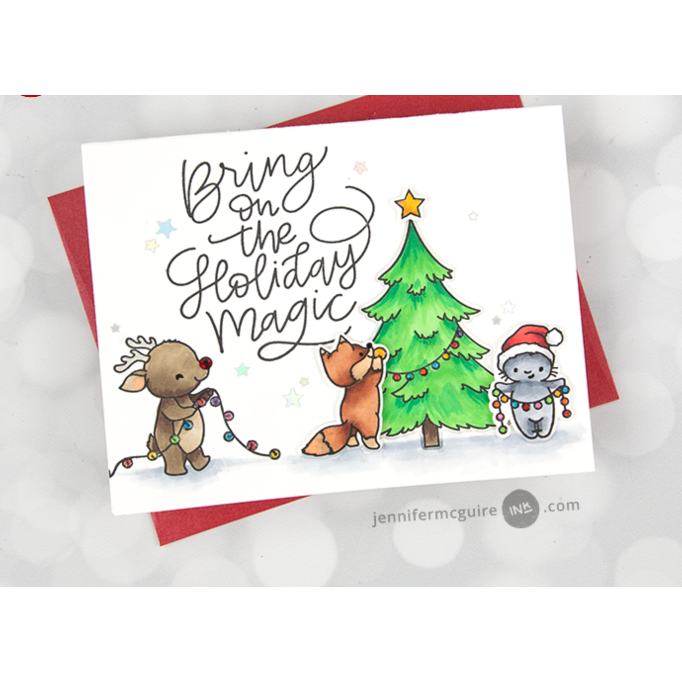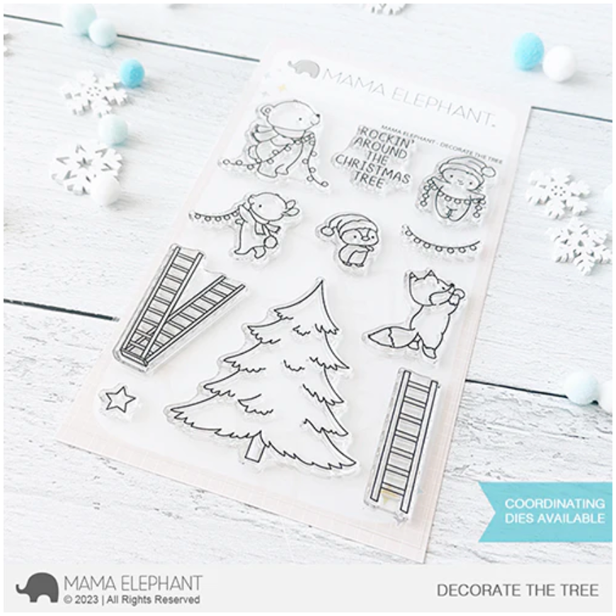 Introducing the Mama Elephant - Decorate the Tree Clear Stamps! This charming 4x6 inch clear stamp set brings the holiday spirit to life with five adorable animals coming together to decorate a pine tree. These cute critters are equipped with ladders, string lights, and a star to place on top of the tree. To complete the festive scene, you'll find a delightful sentiment: Rockin' around the Christmas tree. This set is perfect for creating heartwarming and joyful holiday-themed projects.