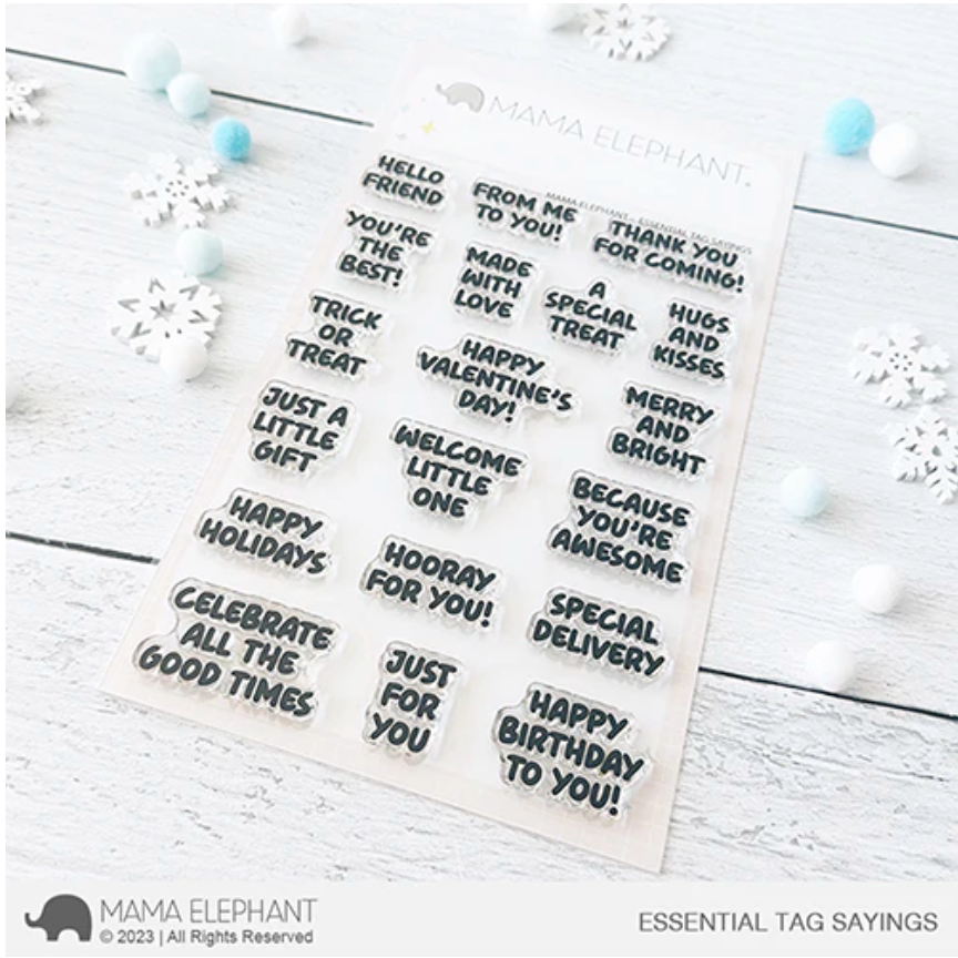 Introducing the Mama Elephant Clear Stamps - Essential Tag Sayings! This versatile 4x6 inch clear stamp set contains a collection of 19 sentiments, making it an ideal choice for crafting custom gift tags. Here are the approximate measurements of some key sentiments: