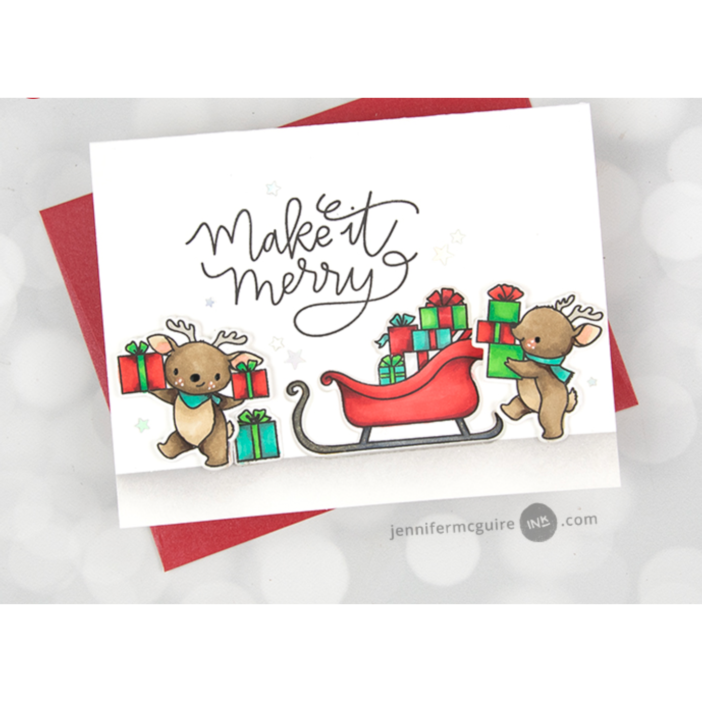 Introducing the Mama Elephant Clear Stamps Holly's Reindeer! This adorable 4x6 inch clear stamp set features 5 charming reindeer all geared up for the holiday season. These tiny reindeer are depicted dancing, carrying wrapped gifts, and adorning string lights, adding a delightful festive touch to your projects. Additionally, you'll find Santa's sled brimming with presents, a string of jingling bells, and two heartwarming sentiments.