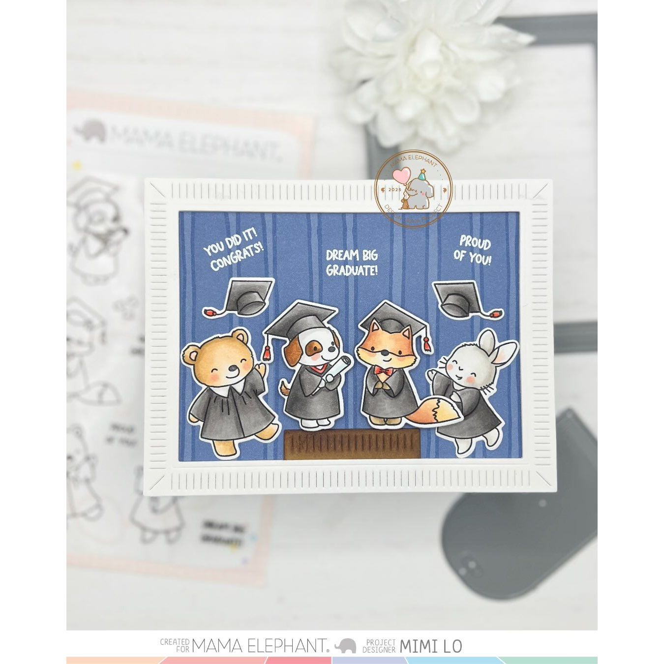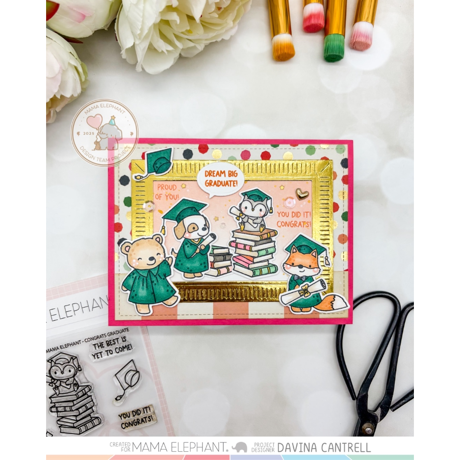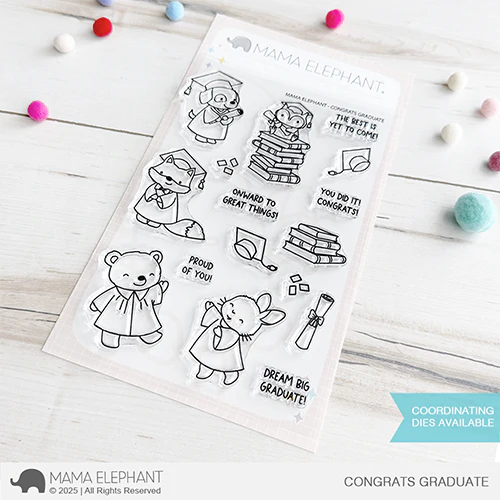The Mama Elephant Congrats Graduate Clear Stamp Set is a 4 x 6 inch set designed to celebrate the graduates in your life. It features 11 images, including 5 critters in caps and gowns, a stack of books, a diploma, and confetti, along with 5 celebratory sentiments. Perfect for creating graduation cards, tags, and keepsakes. Coordinates with the Congrats Graduate Creative Cuts Dies, sold separately.