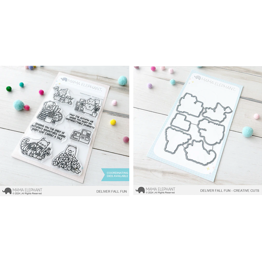 The Mama Elephant Deliver Fall Fun Clear Stamp and Die Set. A 4x6 Photopolymer Stamp Set offers a delightful array of fall-themed scenes and sentiments. With 6 image stamps and 2 sentiment stamps, crafters can create charming cards or projects featuring scenes like a Halloween Witch cat with kittens, an elephant returning to school, a fox with a cornucopia, a bear surrounded by leaves, and a hamster in a cozy living room. For added versatility, the set coordinates seamlessly with the Deliver Fall Fun Creative Cuts, which is also included, providing endless creative possibilities.