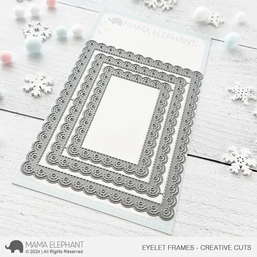 The Mama Elephant Eyelet Frames Creative Cuts is a stand-alone die set that includes 3 nested rectangular frames. Each frame features a delicate lacy scallop pattern, perfect for adding a refined and elegant touch to your projects.