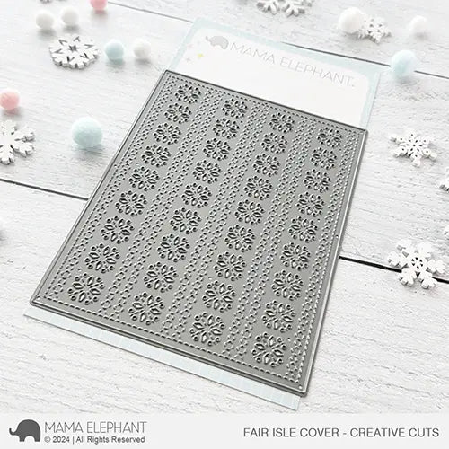 The Mama Elephant Fair Isle Cover Creative Cuts is a stand-alone die designed to create a detailed patterned background with vertical lined detail. This A2-sized die features artistic flowers and stitched circles arranged in evenly spaced stripes, along with a stitched border around the entire die, adding an intricate and elegant touch to your projects.