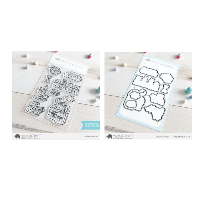 Mama Elephant Game Night Clear Stamp and Die Set combines the 4x6 inch Game Night Clear Stamps with the coordinating Game Night Creative Cuts Steel Dies. This playful set features 9 images of adorable critters engaging in various board games, including chess, Scrabble, and mahjong, along with game pieces and dice. The 9 coordinating outline dies precisely cut out each stamped image, making it easy to add dimension to your projects. Compatible with most die-cutting machines.