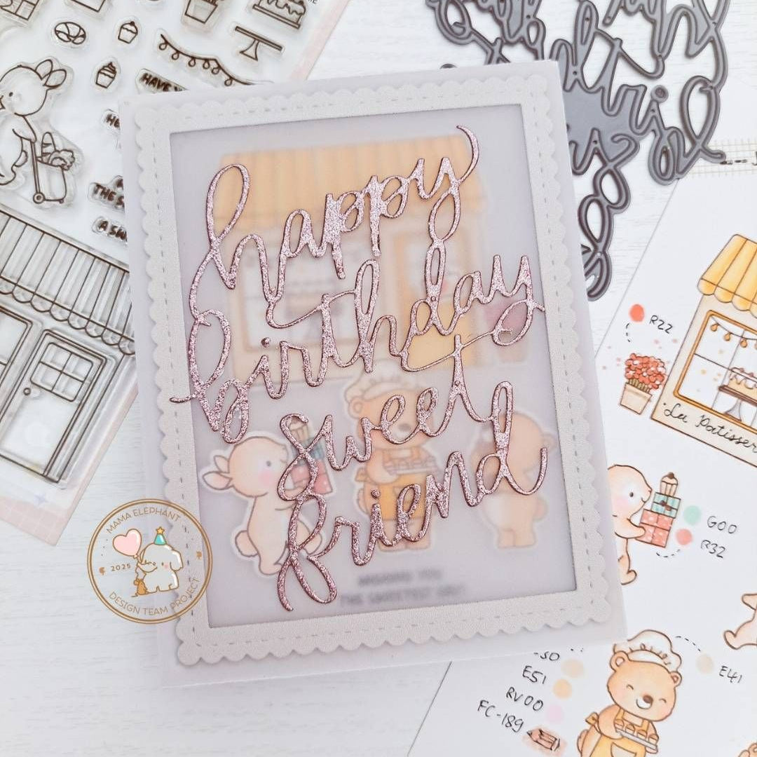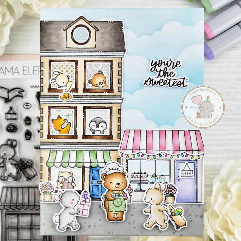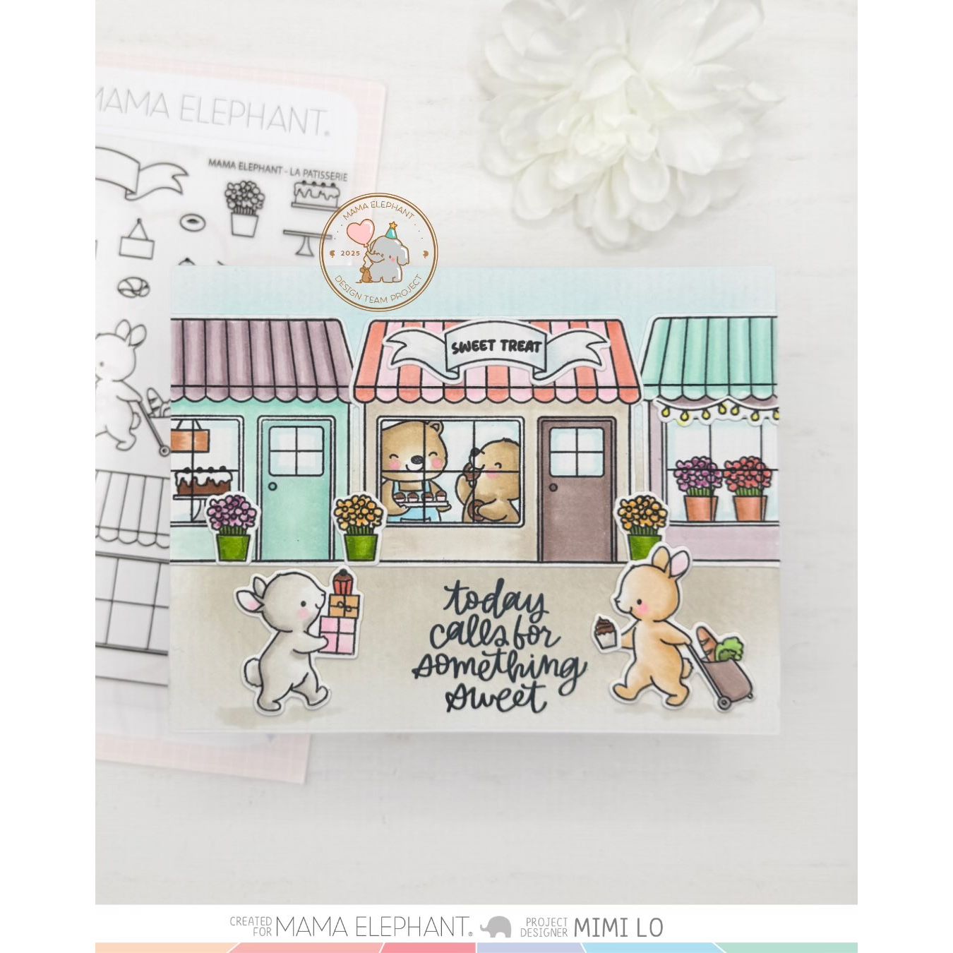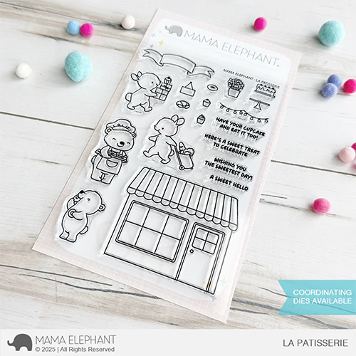 The Mama Elephant La Patisserie Clear Stamps are perfect for creating the sweetest scenes! The 4x6 inch clear stamp set includes 15 images and 4 sentiments to help you build an adorable patisserie filled with charm. Design a storefront, add a baker, three shoppers, signs, flowers, sweets, and decorative elements to complete your scene. Use the included sentiments to add the perfect finishing touch.