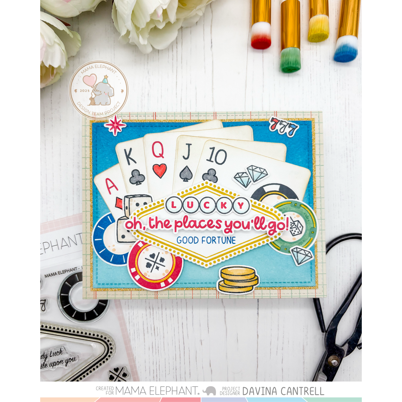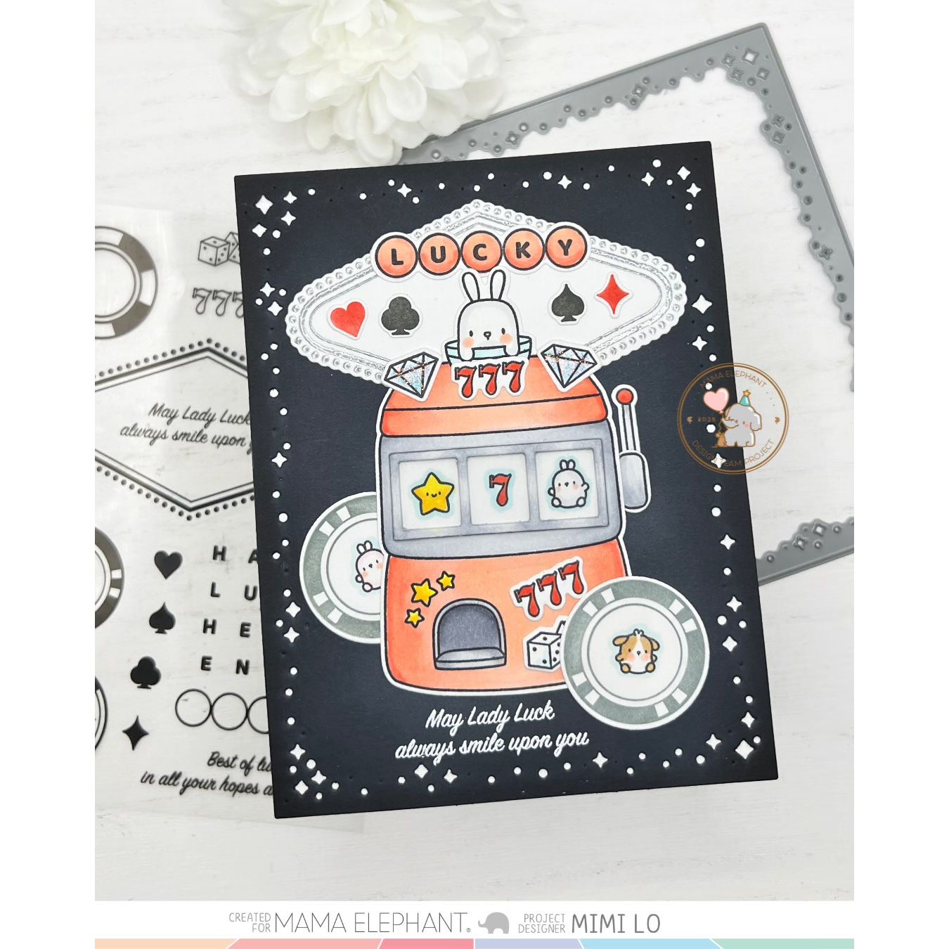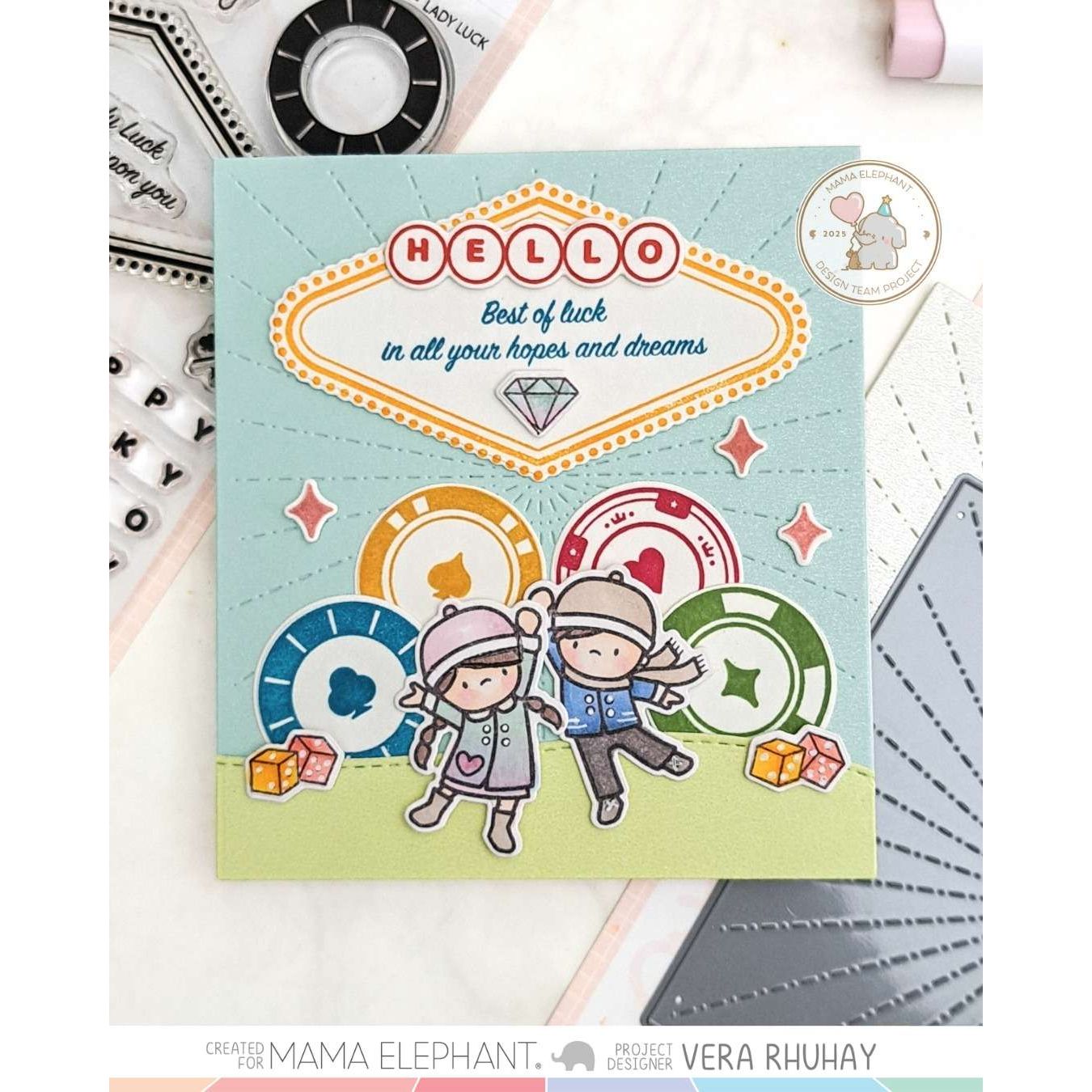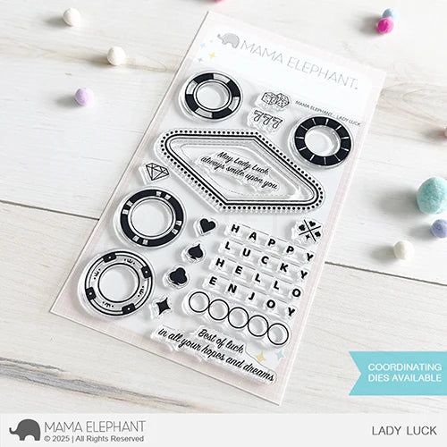 Mama Elephant Lady Luck Clear Stamps is a 4x6 inch set featuring poker chip designs, a flashy frame border, diamonds, symbols, and sentiments—all with a bold Las Vegas or casino theme. Coordinates with the Lady Luck Creative Cuts Steel Dies, sold separately.