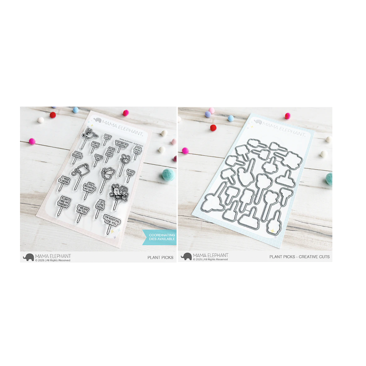 The Mama Elephant Plant Picks Clear Stamp and Die Set includes a 4 x 6 inch stamp set with 5 images and 14 punny sentiments, featuring critters and plant markers perfect for garden-themed projects. The coordinating die set includes 19 outline dies to cut out the stamped images. Great for cards, tags, garden labels, and more. Compatible with most die-cutting machines.