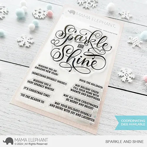 The Mama Elephant Sparkle and Shine Clear Stamps is a 4x6 inch photopolymer clear stamp set that includes 10 holiday-themed sentiment stamps. These stamps are perfect for adding festive and joyful messages to your holiday projects.